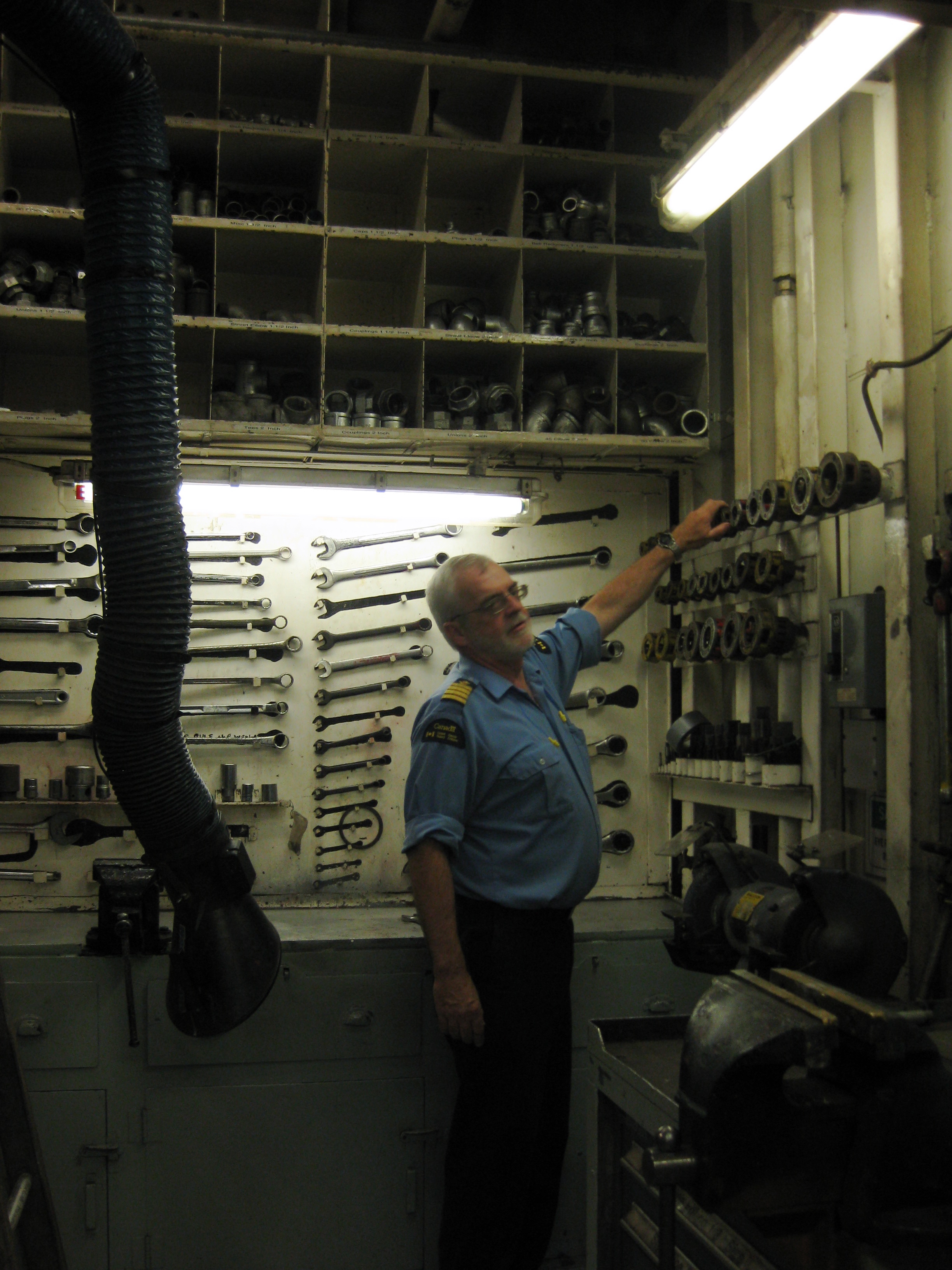 Gerty Ward says, "the tool room with everything, absolutely everything!" In the engine room, aboard the Canadian Coast Guard icebreaker Louis S. St-Laurent, on the Beaufort Sea.