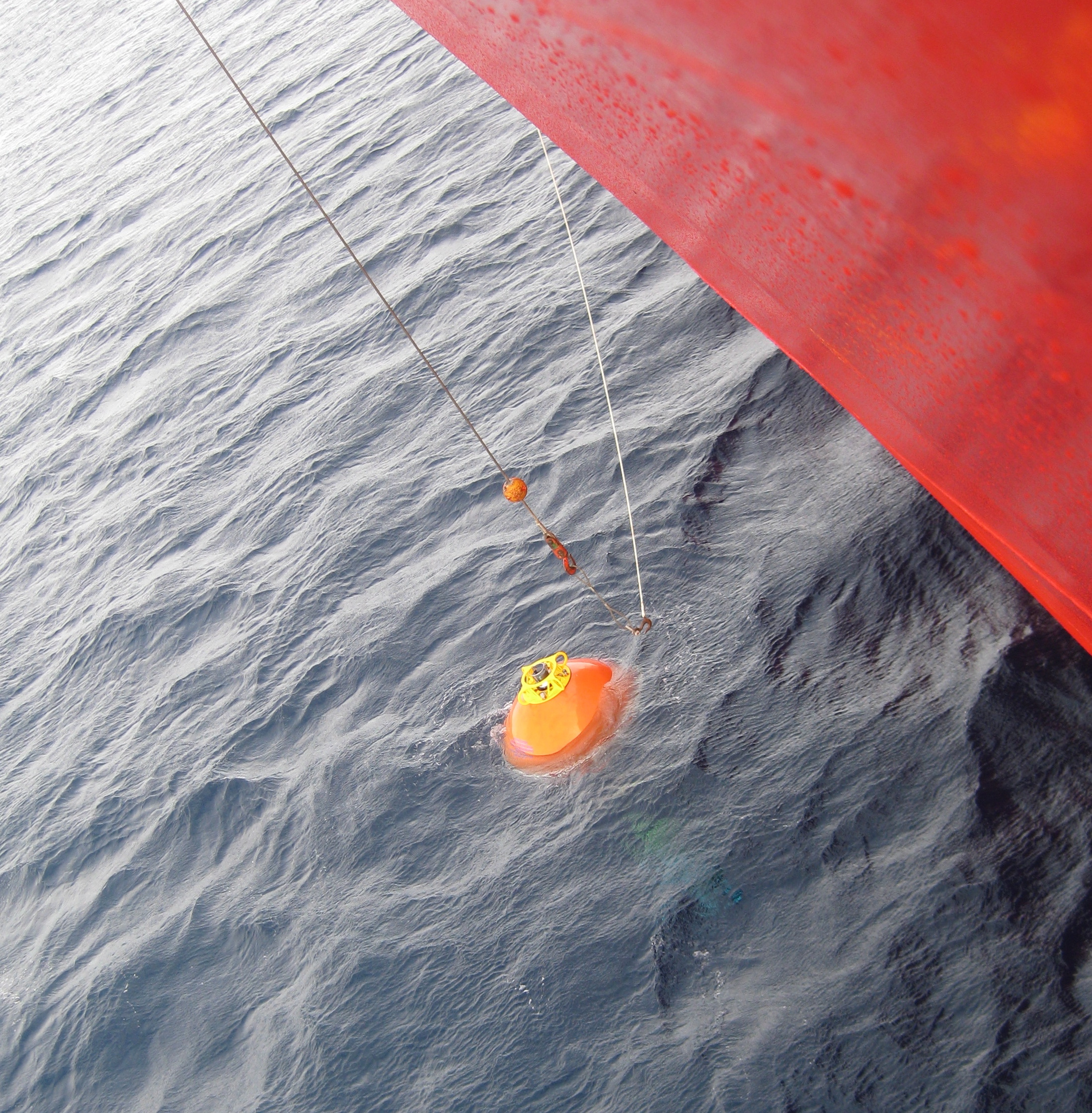 Gerty Ward says, "to bring the top float on board, it first has to be caught! A hook is lowered with a control rope (white, to the right of the line) and not unlike that arcade game where you maneuver a joy stick to pick up a prize, the top float is hooked." Aboard the Canadian Coast Guard icebreaker Louis S. St-Laurent, on the Beaufort Sea.