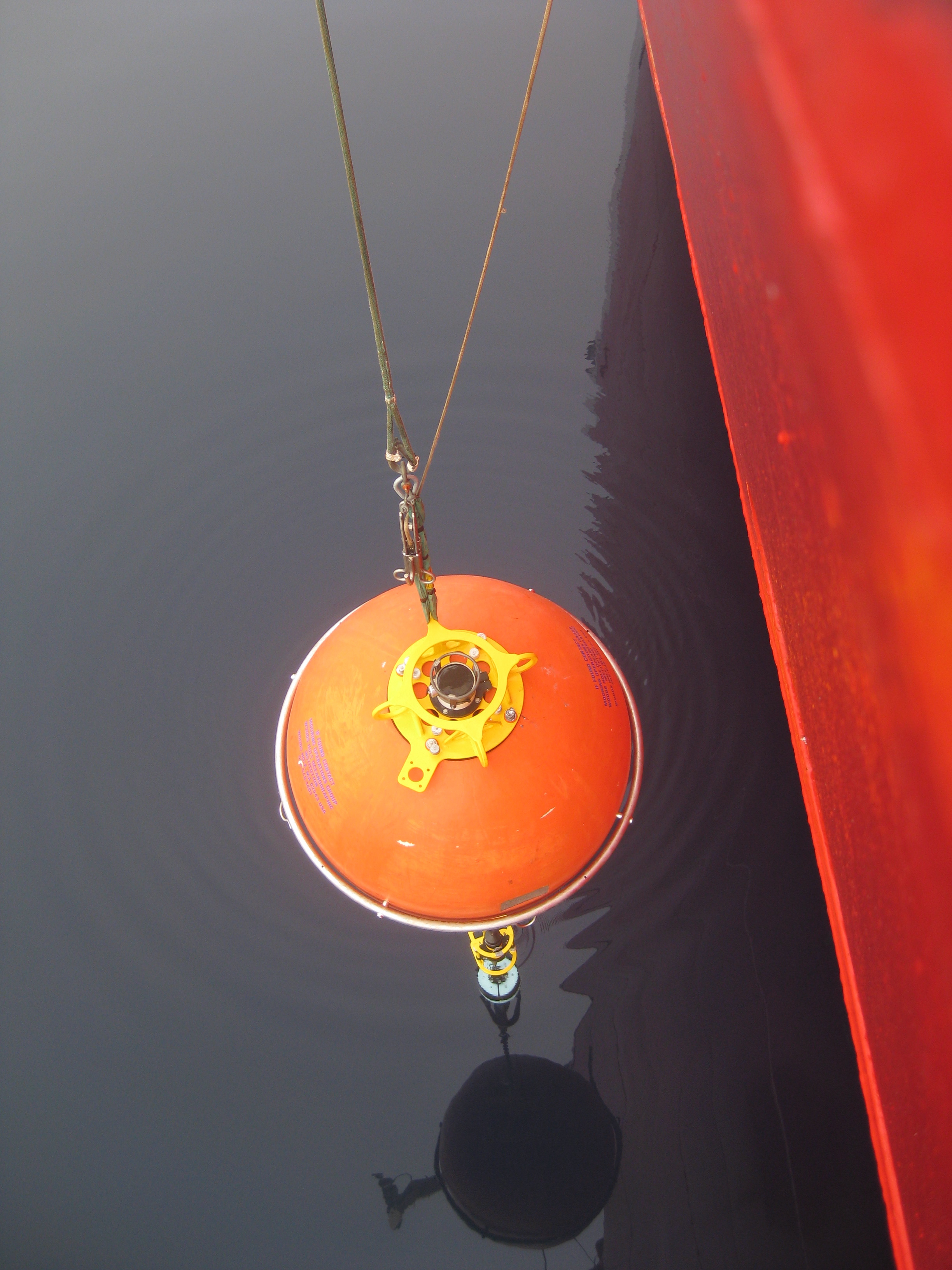 The top float is lowered off the ship deck. Aboard the Canadian Coast Guard icebreaker Louis S. St-Laurent, on the Beaufort Sea.