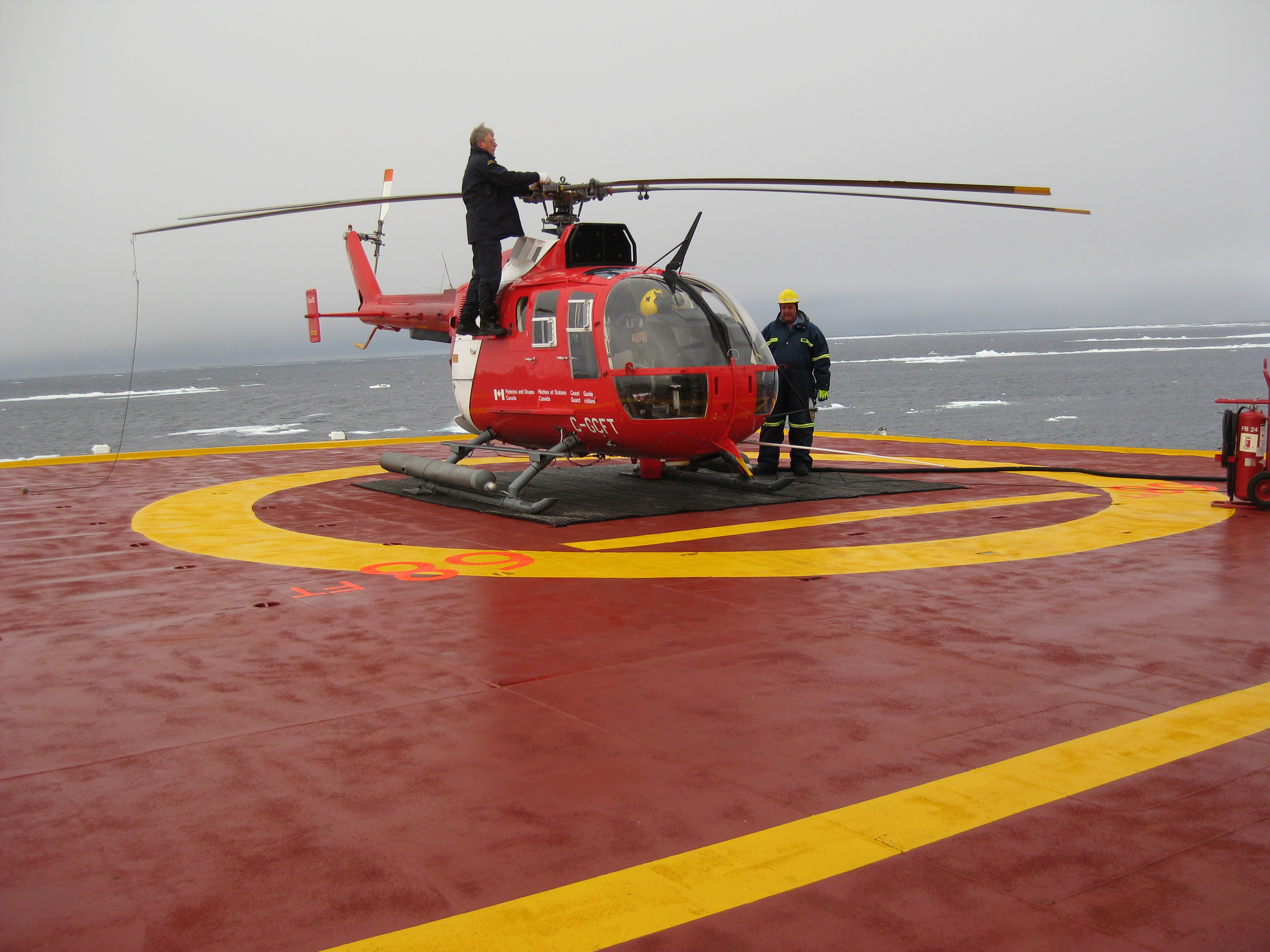 Helicopter engineer Ric Daine prepares for flight. On the heli deck aboard the Canadian Coast Guard icebreaker Louis S. St-Laurent, on the Beaufort Sea.