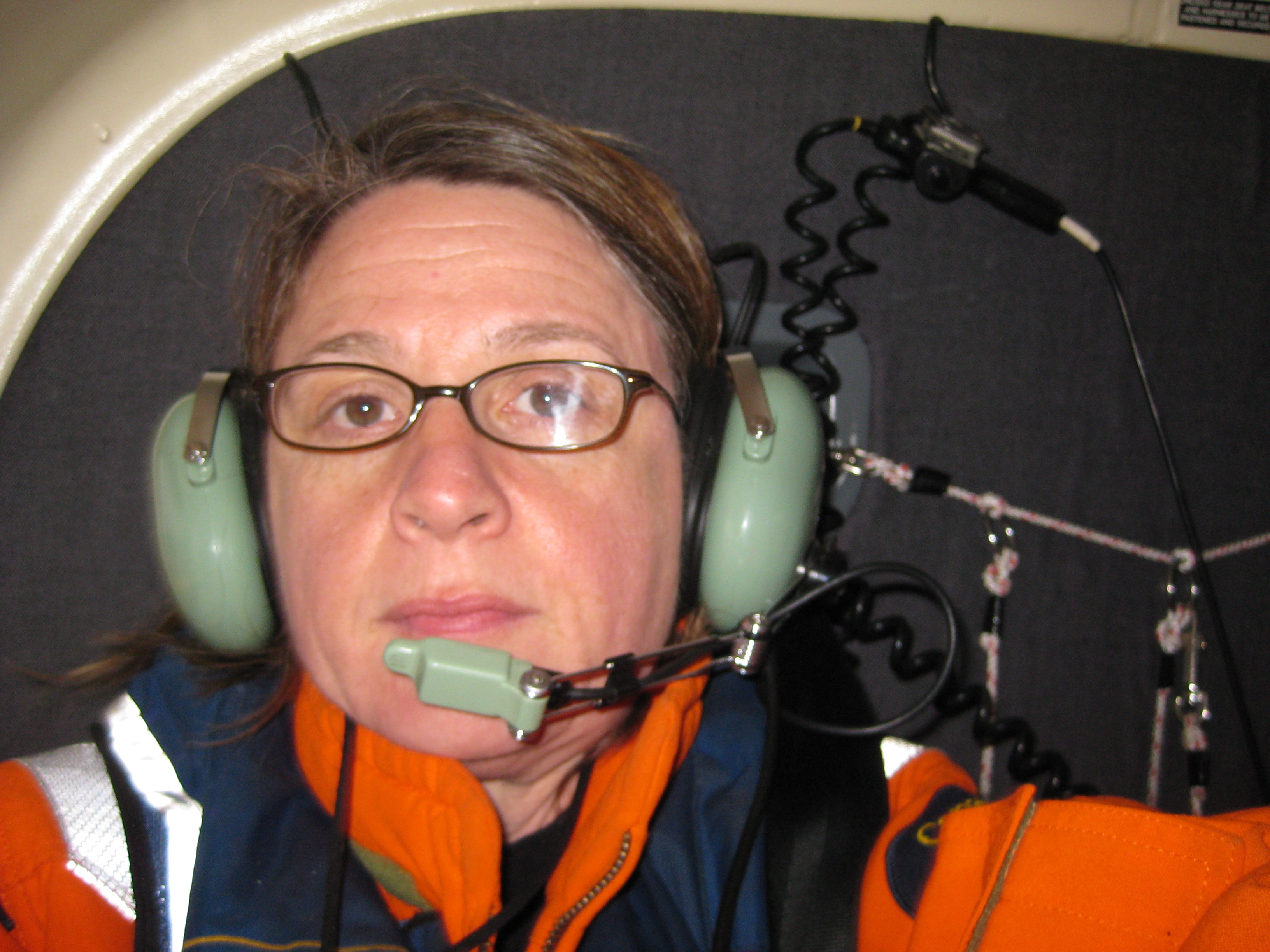 Gerty Ward in the helicopter, just before take-off. On the heli deck aboard the Canadian Coast Guard icebreaker Louis S. St-Laurent, on the Beaufort Sea.