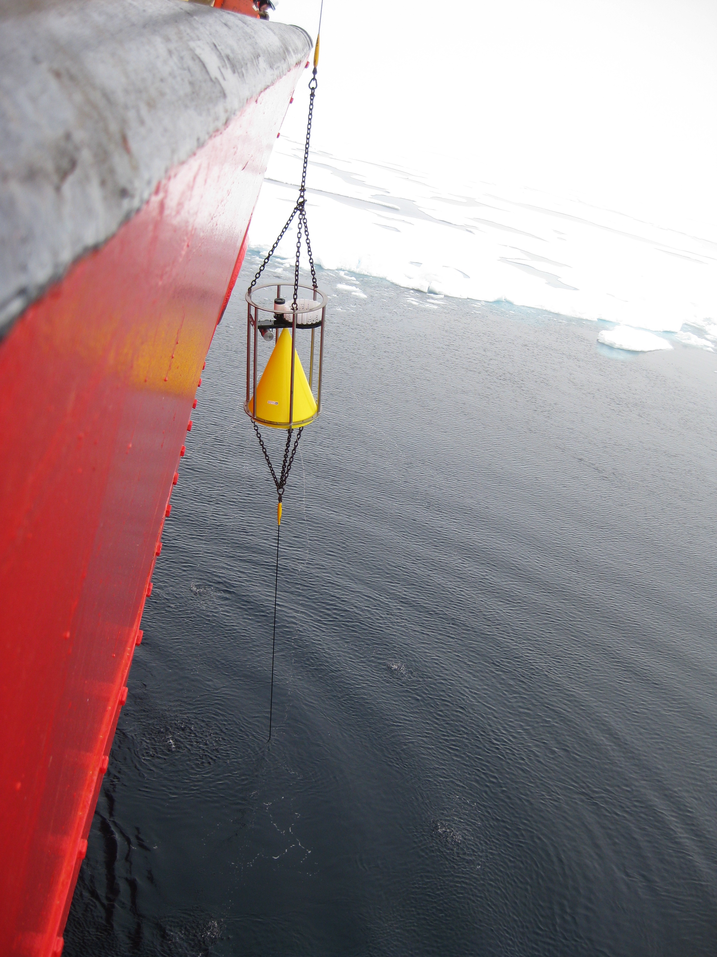 Recovering the trap from the tail end means everything comes in upside down. The trap samples are safely sealed. Aboard the Canadian Coast Guard icebreaker Louis S. St-Laurent, on the Beaufort Sea.