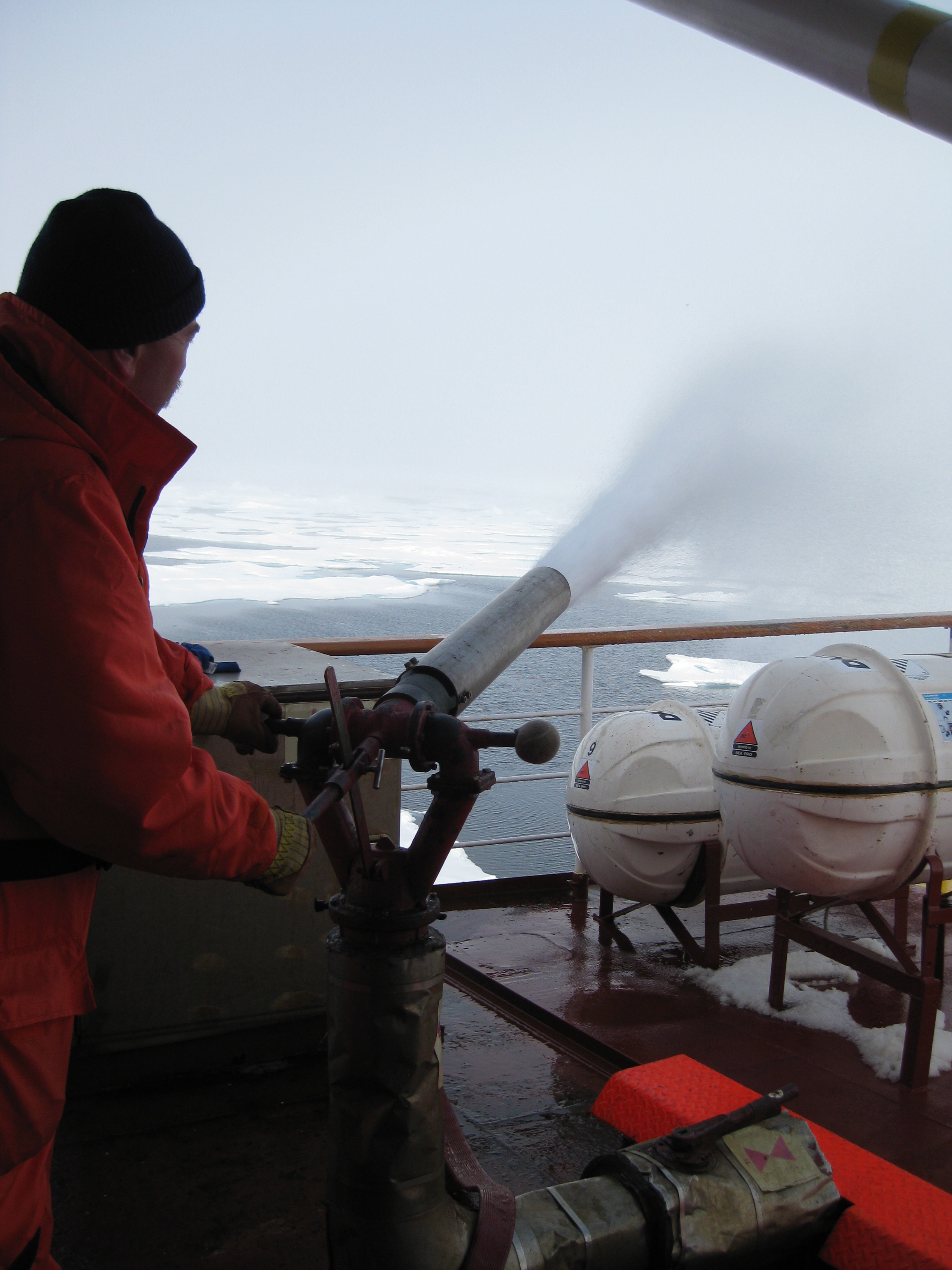 Engineer Derek Keough tests the fire hose on the heli deck. Aboard the Canadian Coast Guard icebreaker Louis S. St-Laurent, on the Beaufort Sea.