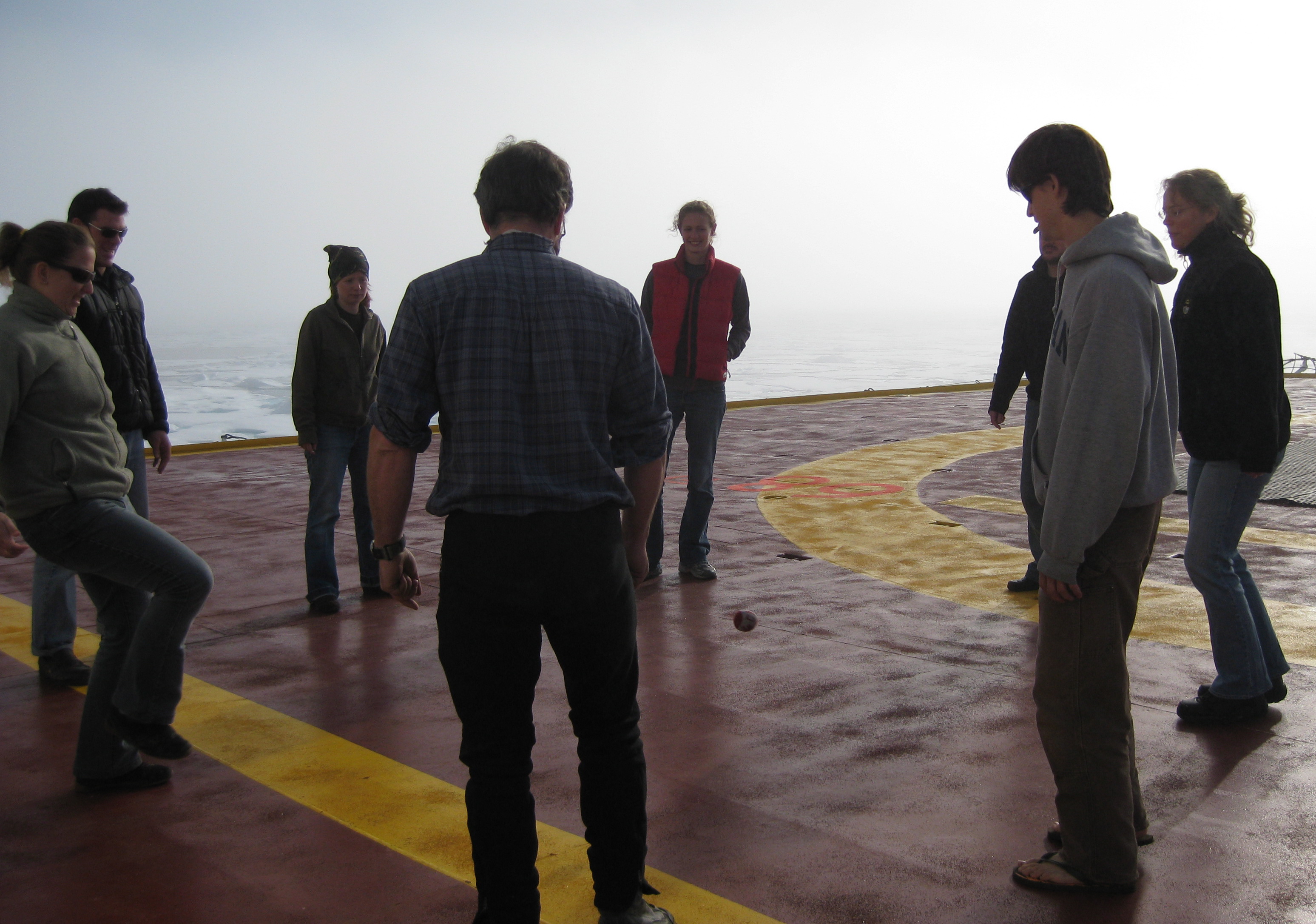 Taking advantage of the sun, some scientists try their feet at hacky sack. Aboard the Canadian Coast Guard icebreaker Louis S. St-Laurent, on the Beaufort Sea.