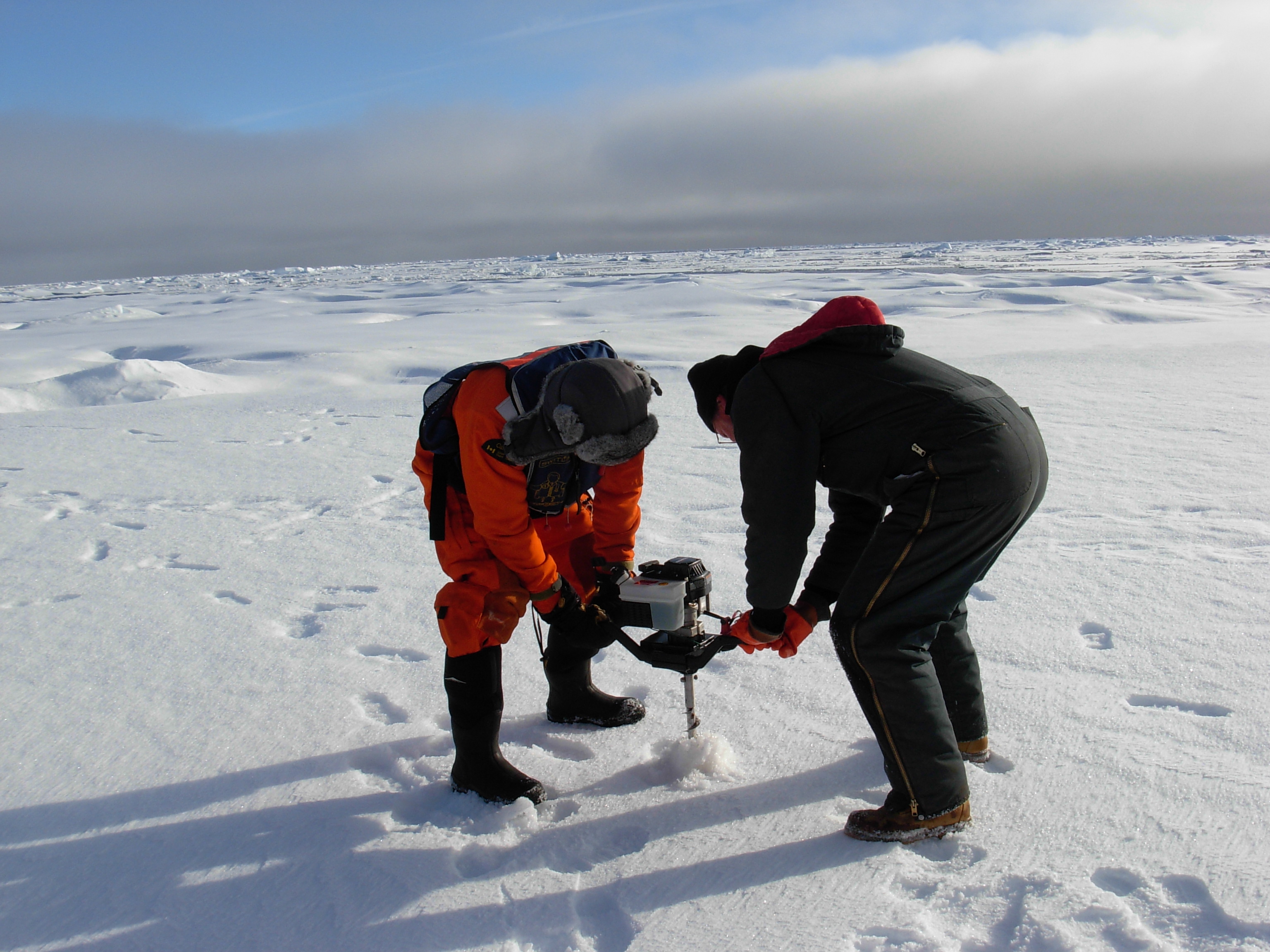 Will and Rick drill through the ice. This ice floe is too thin for an ITP (Ice-Tethered Profiler) deployment. On the sea ice near the Canadian Coast Guard icebreaker Louis S. St-Laurent, on the Beaufort Sea.