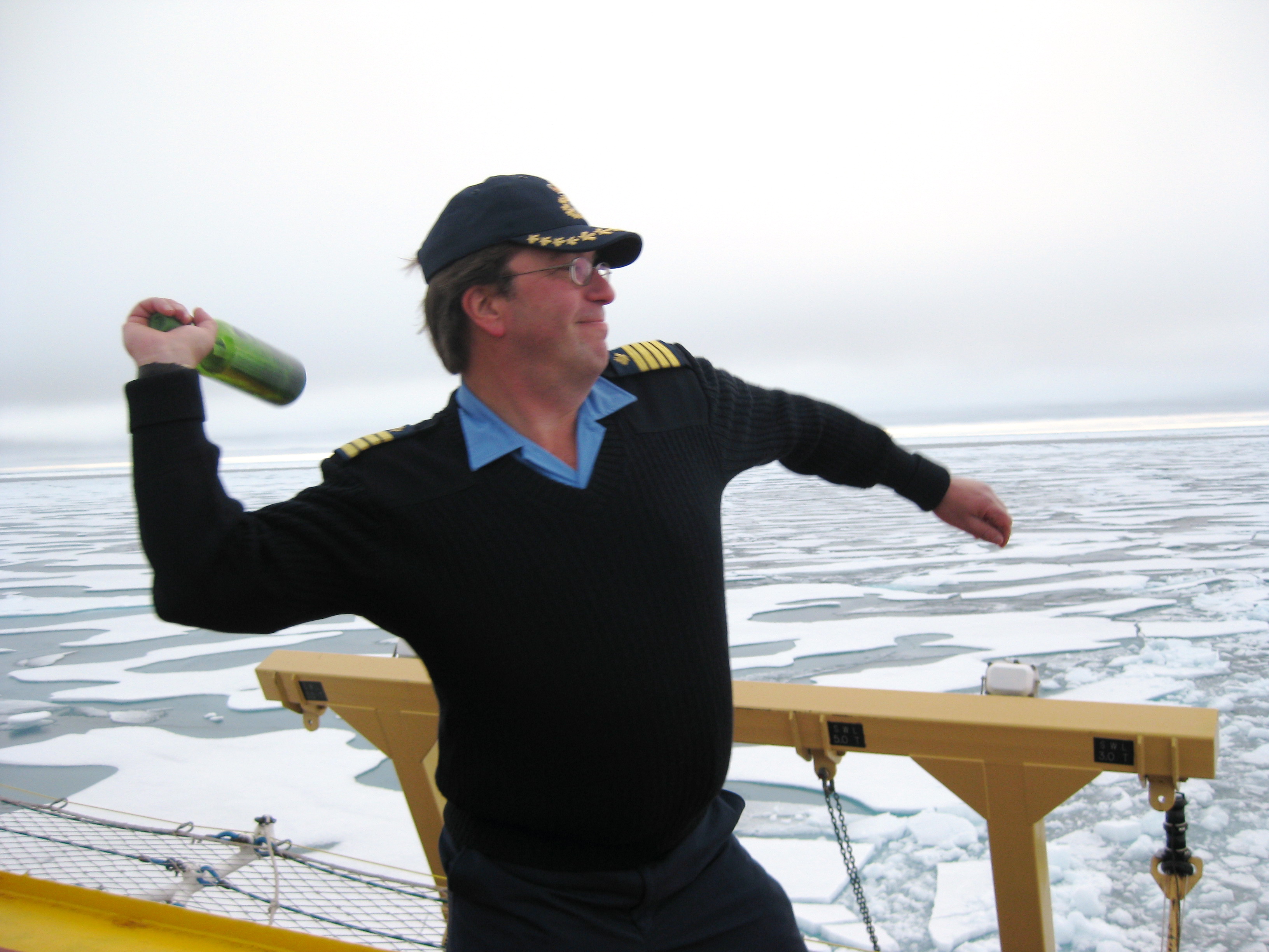 Captain McNeill tosses a drift bottle off of the LSSL heli deck, at 83N, 150W. Aboard the Canadian Coast Guard icebreaker Louis S. St-Laurent, on the Beaufort Sea.