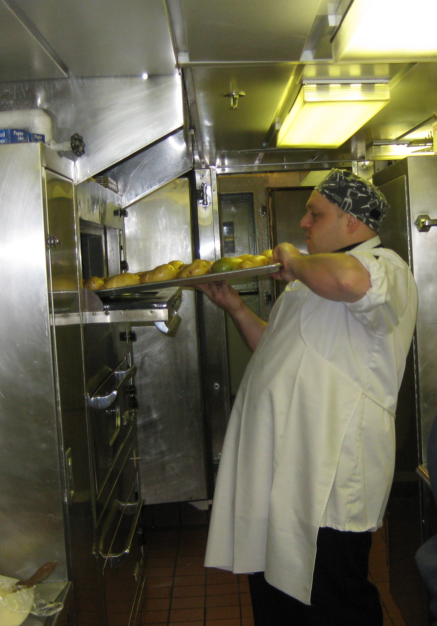 Gerty Ward says, "cooks are always planning ahead. During lunch, Joe Gurney roasts potatoes for the next meal." Aboard the Canadian Coast Guard icebreaker Louis S. St-Laurent, on the Beaufort Sea.