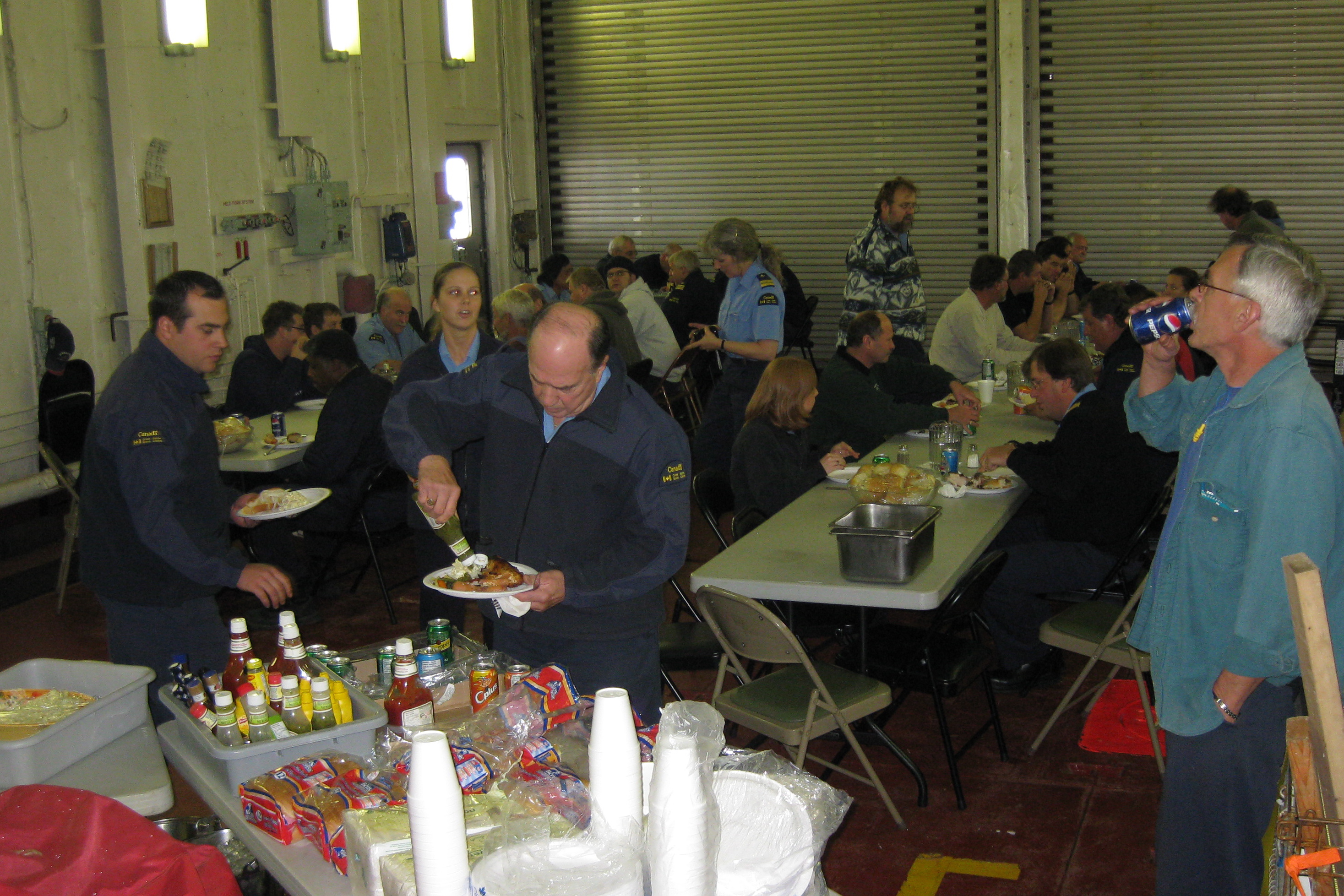 A BBQ dinner in the helicopter hanger. Aboard the Canadian Coast Guard icebreaker Louis S. St-Laurent, on the Beaufort Sea.
