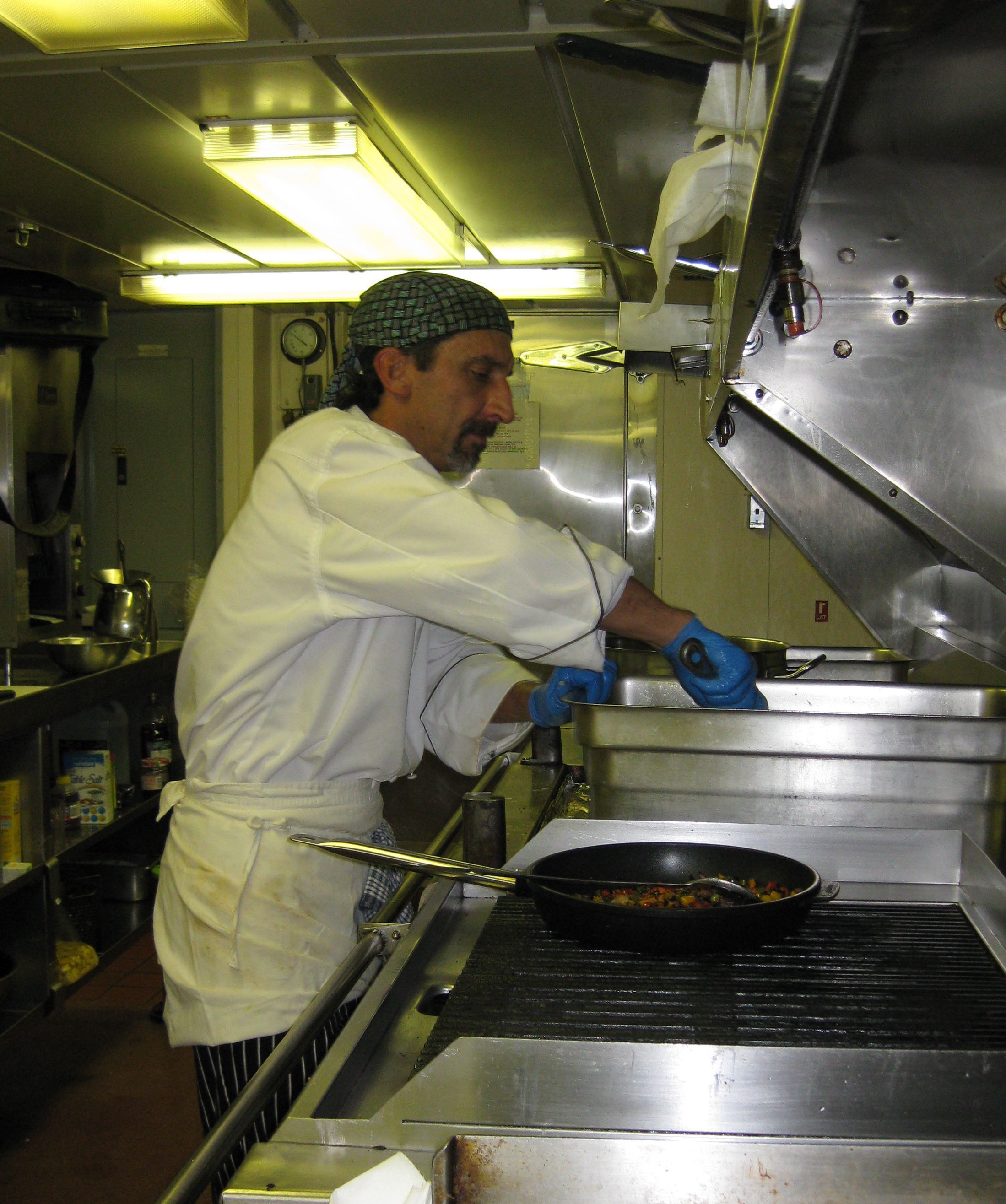 Gerty Ward says, "Randy is working on several parts of the upcoming dinner. Though there are 79 people on board, we eat like 120!" Aboard the Canadian Coast Guard icebreaker Louis S. St-Laurent, on the Beaufort Sea.