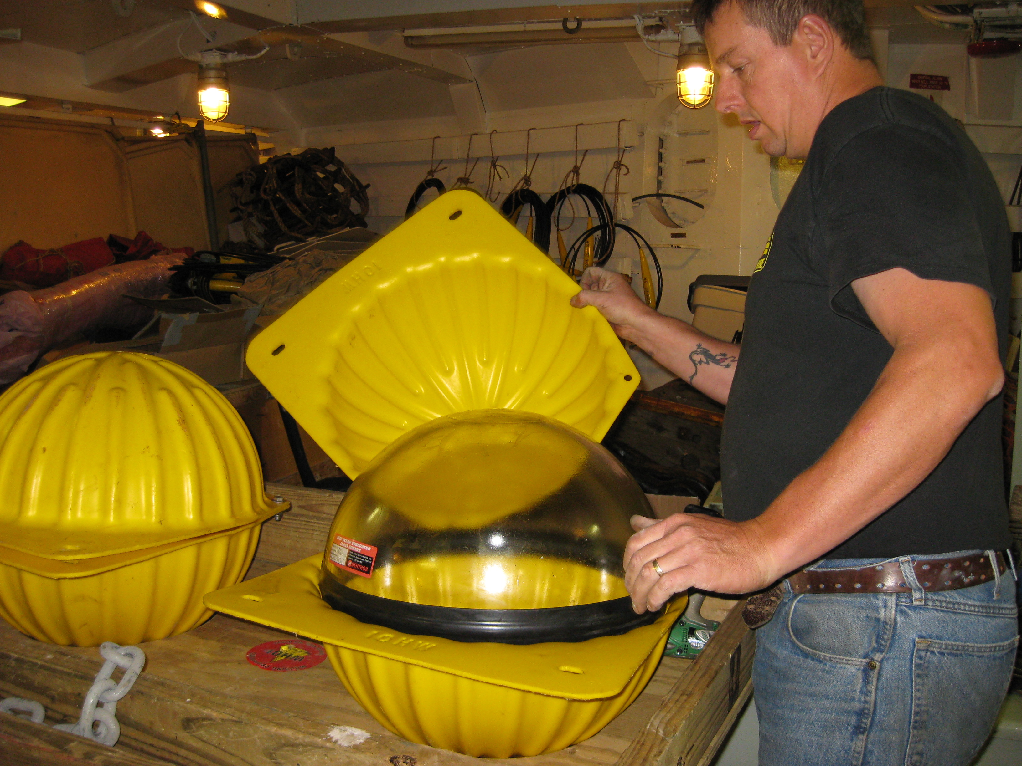 Jim Dunn opens the yellow hard hat to reveal the glass ball inside. Aboard the Canadian Coast Guard icebreaker Louis S. St-Laurent, on the Beaufort Sea.