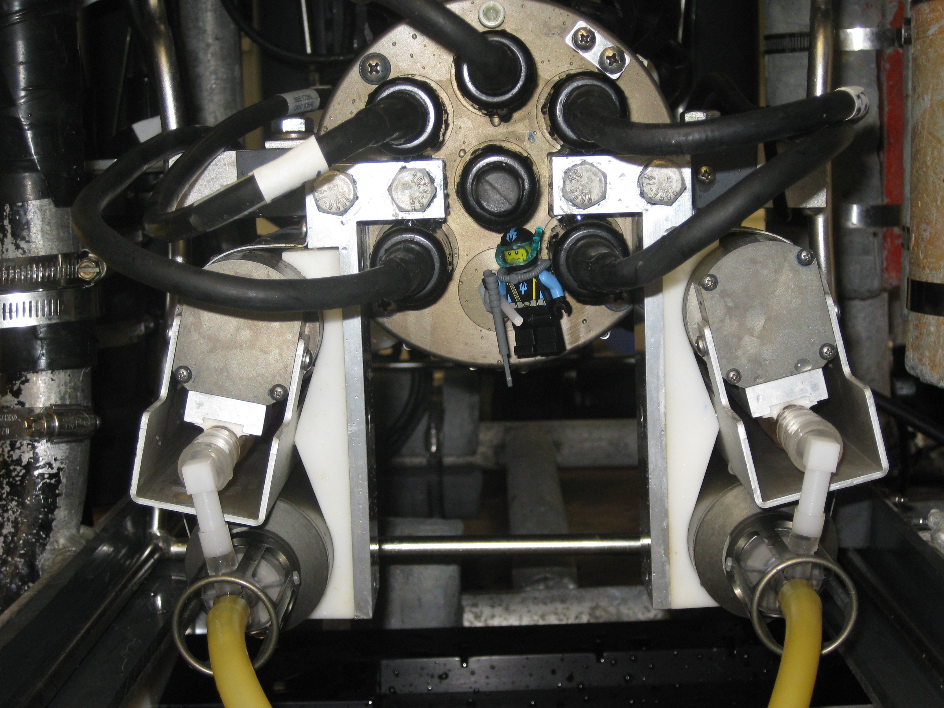 Gerty Ward says, "Diver Man is hanging on the pressure sensor of the CTD (Conductivity, Temperature, and Depth probe)." In the Rosette shack, aboard the Canadian Coast Guard icebreaker Louis S. St-Laurent, on the Beaufort Sea.