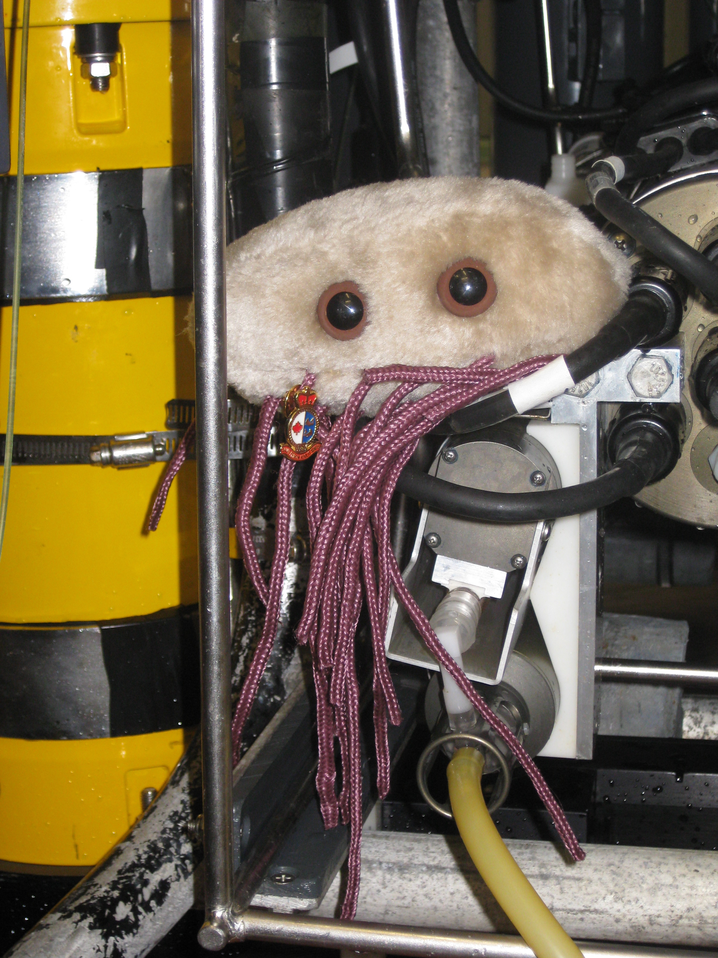Gerty Ward says, "Eli the E. coli's right-most cilium is draped over the temperature sensor on the CTD (Conductivity, Temperature, and Depth probe)." In the Rosette shack, aboard the Canadian Coast Guard icebreaker Louis S. St-Laurent, on the Beaufort Sea.