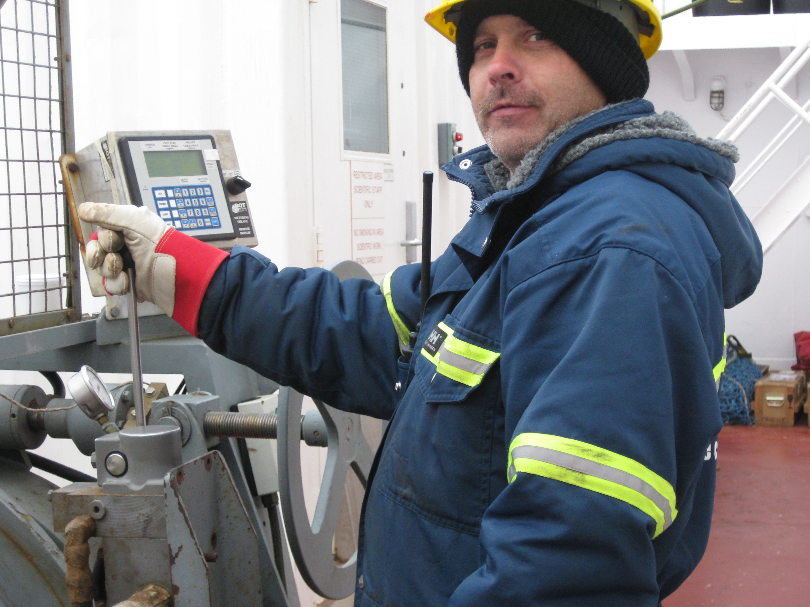Dan Staples runs the winch for the bongo nets on the fore deck. Aboard the Canadian Coast Guard icebreaker Louis S. St-Laurent, on the Beaufort Sea.