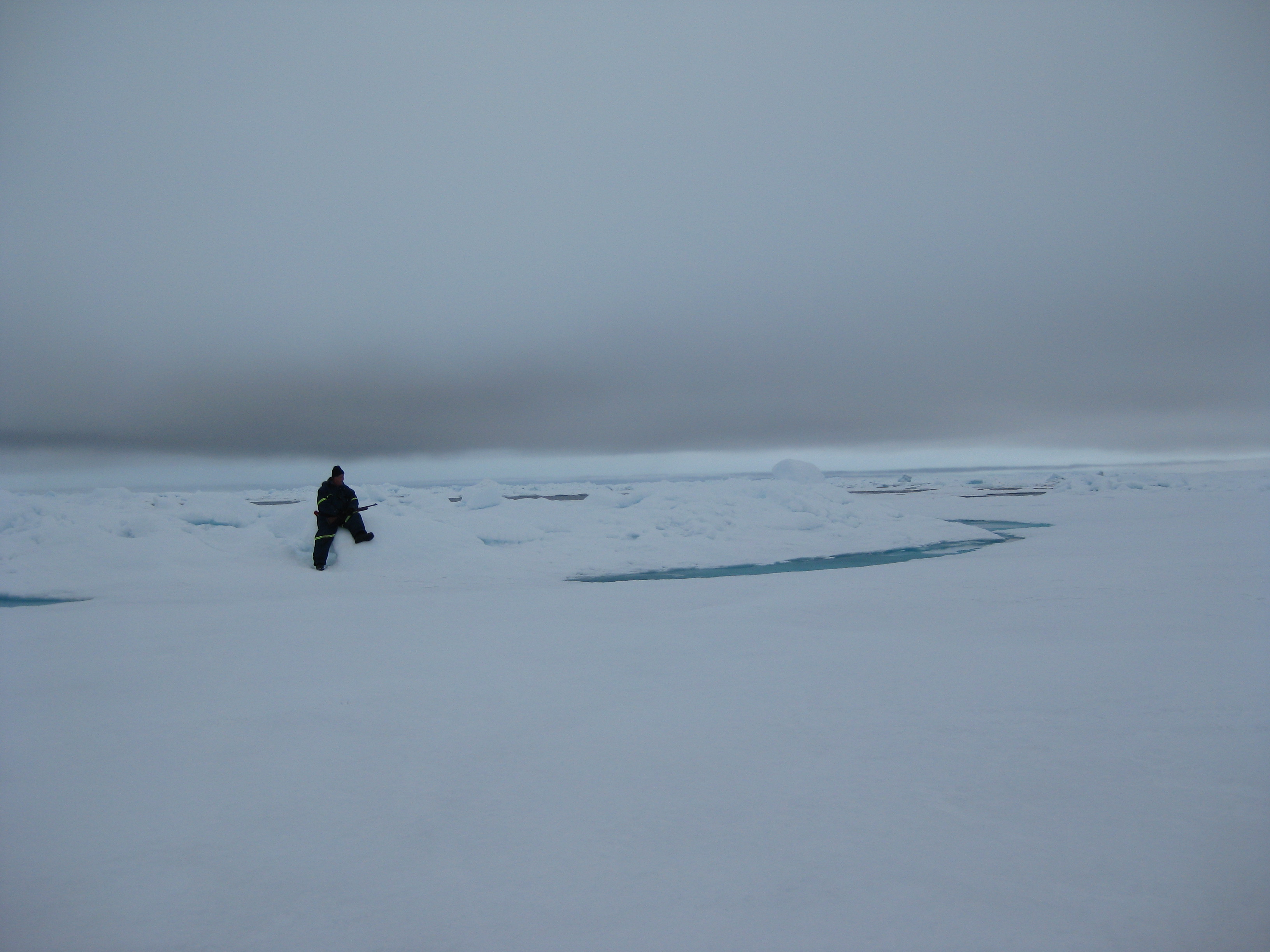 Dave McGrath watches out for polar bears at Ice Camp Moonscape. On the sea ice near the Canadian Coast Guard icebreaker Louis S. St-Laurent, on the Beaufort Sea.