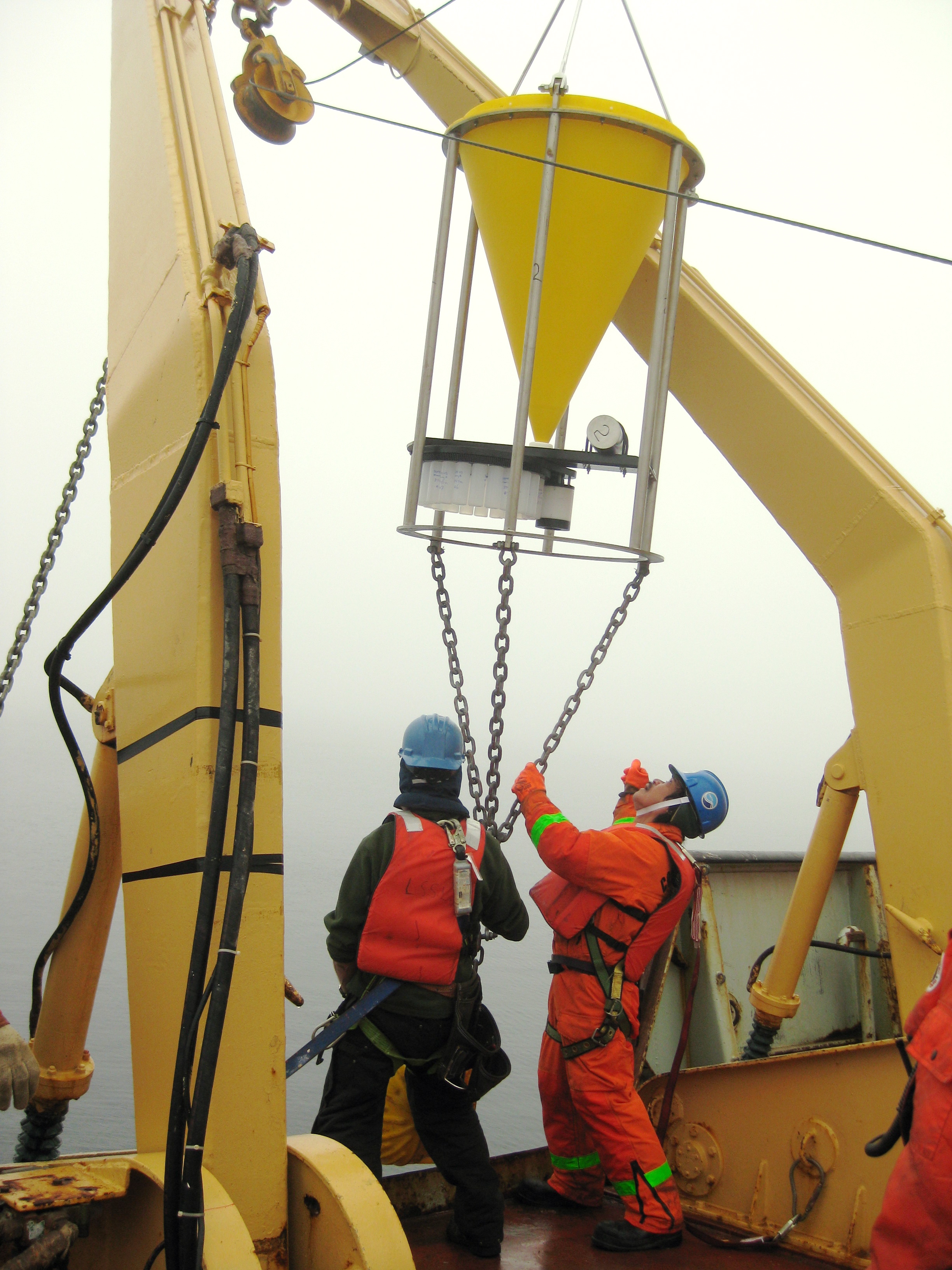 Bosun Rico and Will Ostrom guide a sediment trap on a mooring onto the ship. Aboard the Canadian Coast Guard icebreaker Louis S. St-Laurent, on the Beaufort Sea.