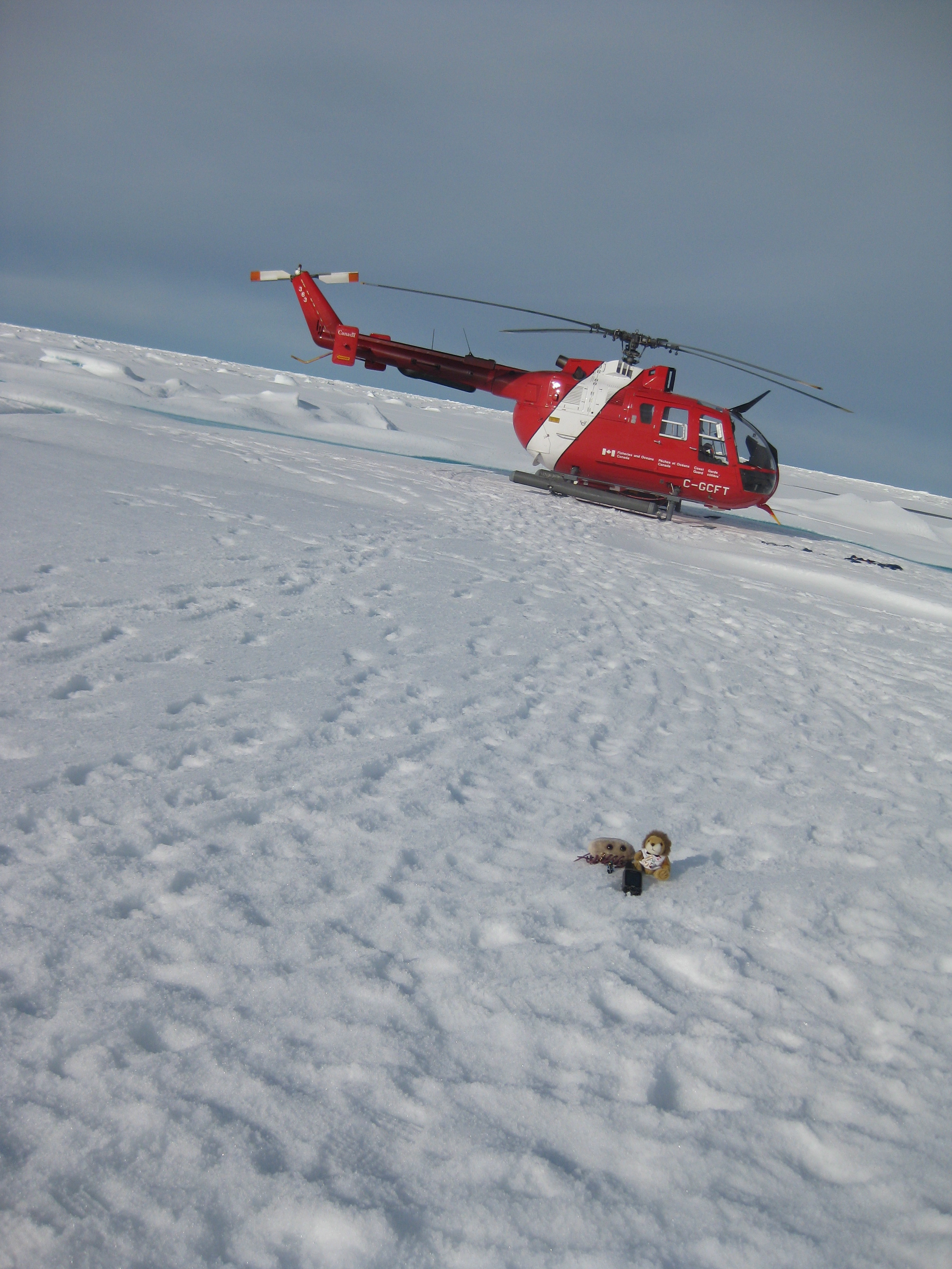 Gerty Ward says, "my arctic friends in front of the helicopter. The helicopter is the way back to the ship for us." On the sea ice near the Canadian Coast Guard icebreaker Louis S. St-Laurent, on the Beaufort Sea.