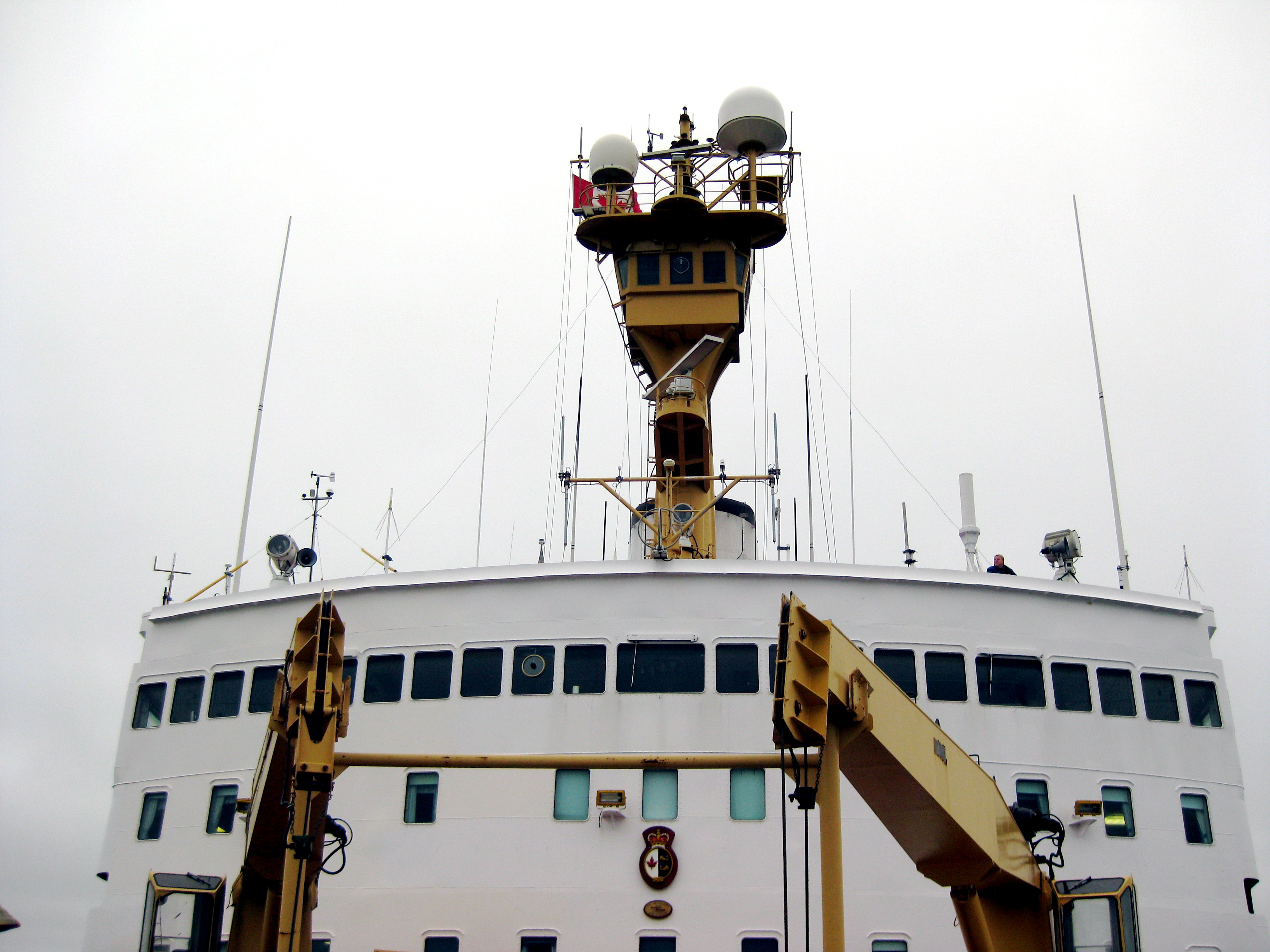 Above the bridge stands the highest point on the ship, the yellow crow's nest. Aboard the Canadian Coast Guard icebreaker Louis S. St-Laurent, on the Beaufort Sea.