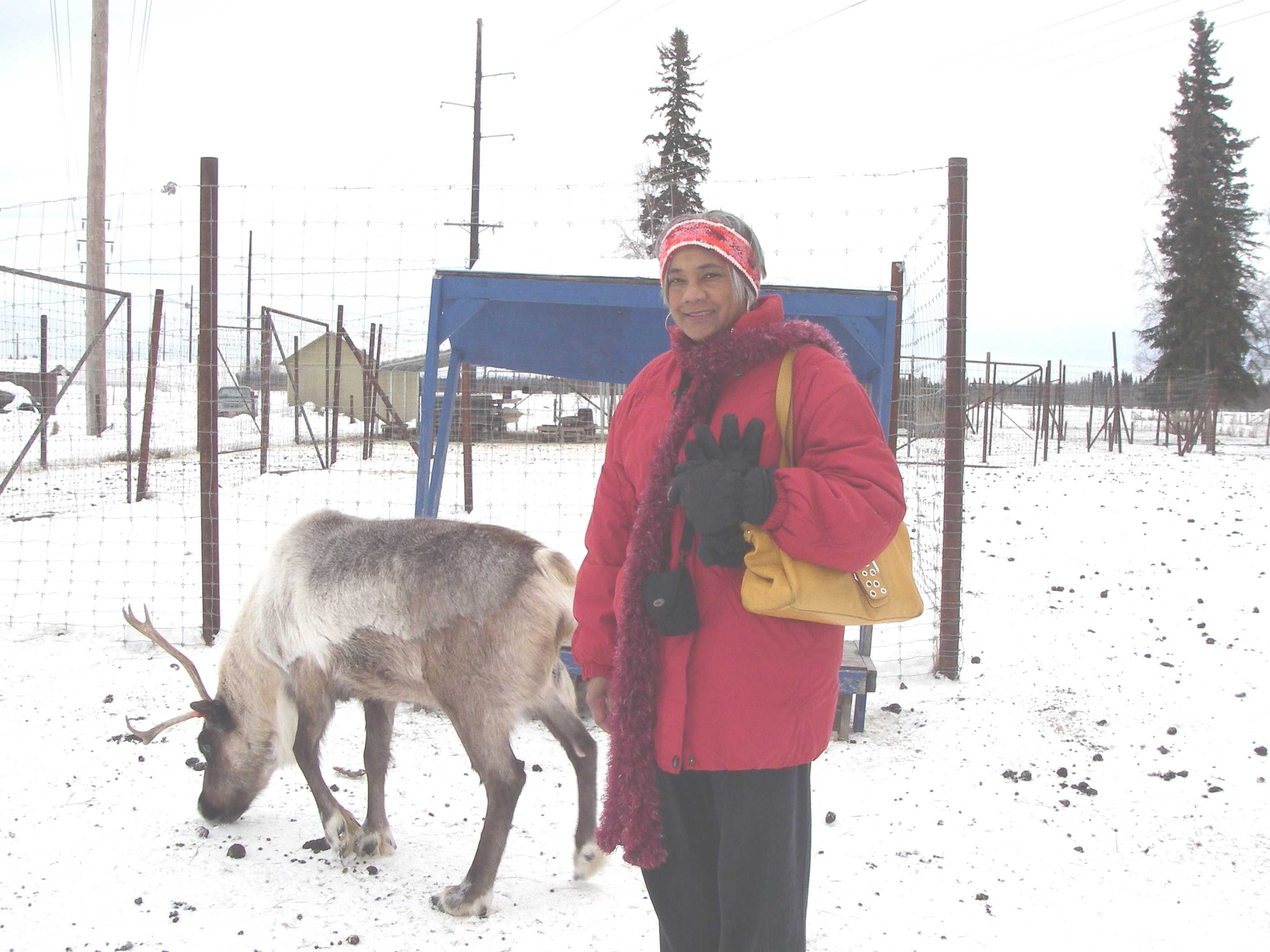 Jackie Hams and a reindeer friend at the Reindeer Research Program at the University of Alaska Fairbanks.