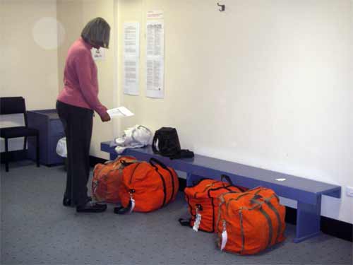 Jackie Hams checks her clothing list carefully to make sure that she packed correctly, and in the right order. At the Clothing Distribution Center in Christchurch, New Zealand.