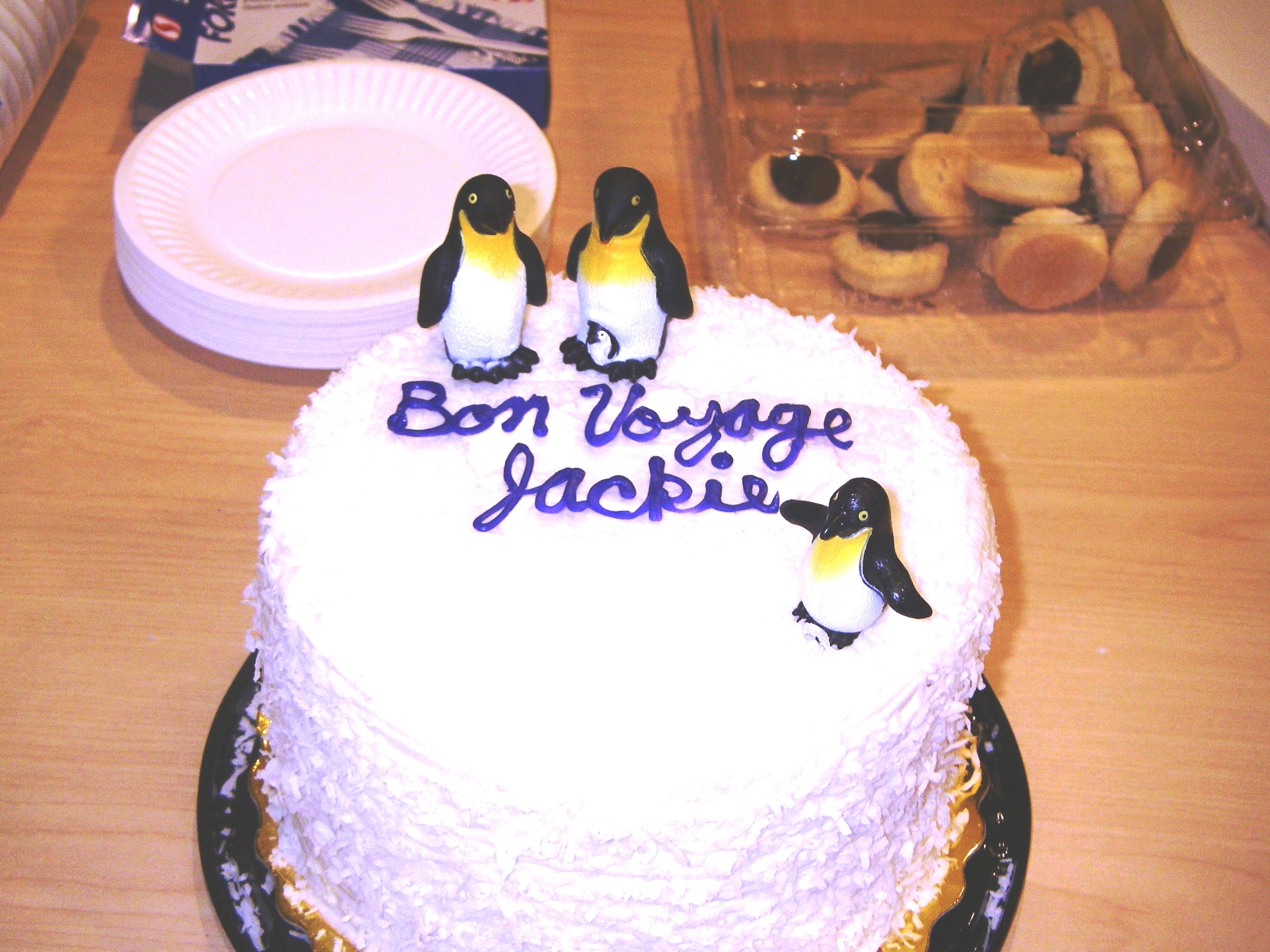 Jackie Hams' bon voyage cake, complete with penguins. Los Angeles Valley College, Valley Glen, California.