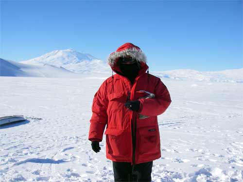 Jackie Hams posing with Mt. Erebus in the background. At the beginning of Happy Camper School. Near McMurdo Station, Antarctica.
