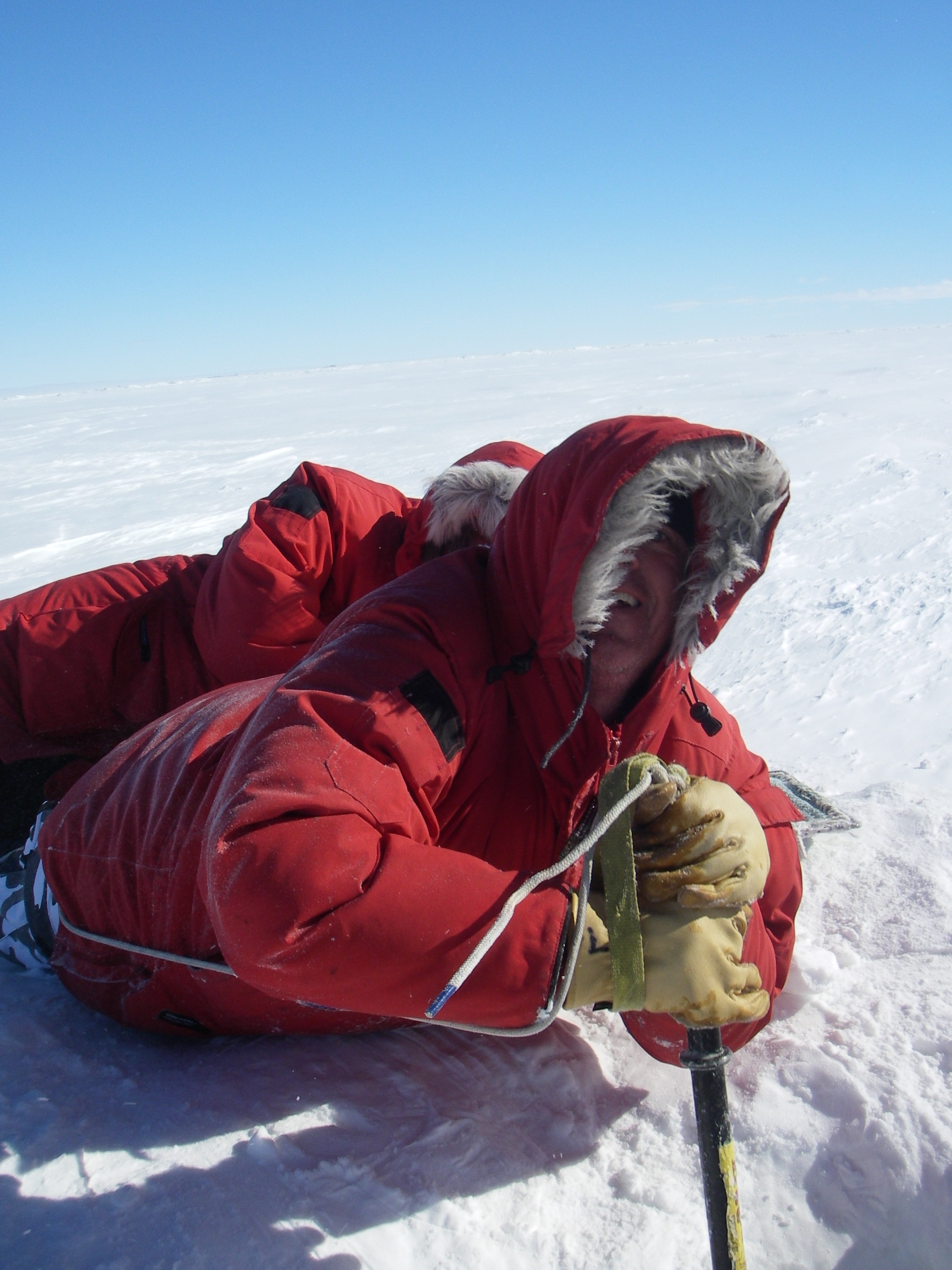 Marco punches a hole in the sea ice, while Jackie Hams lays on top of his legs so that he doesn't fall in. Near McMurdo Station, Antarctica.