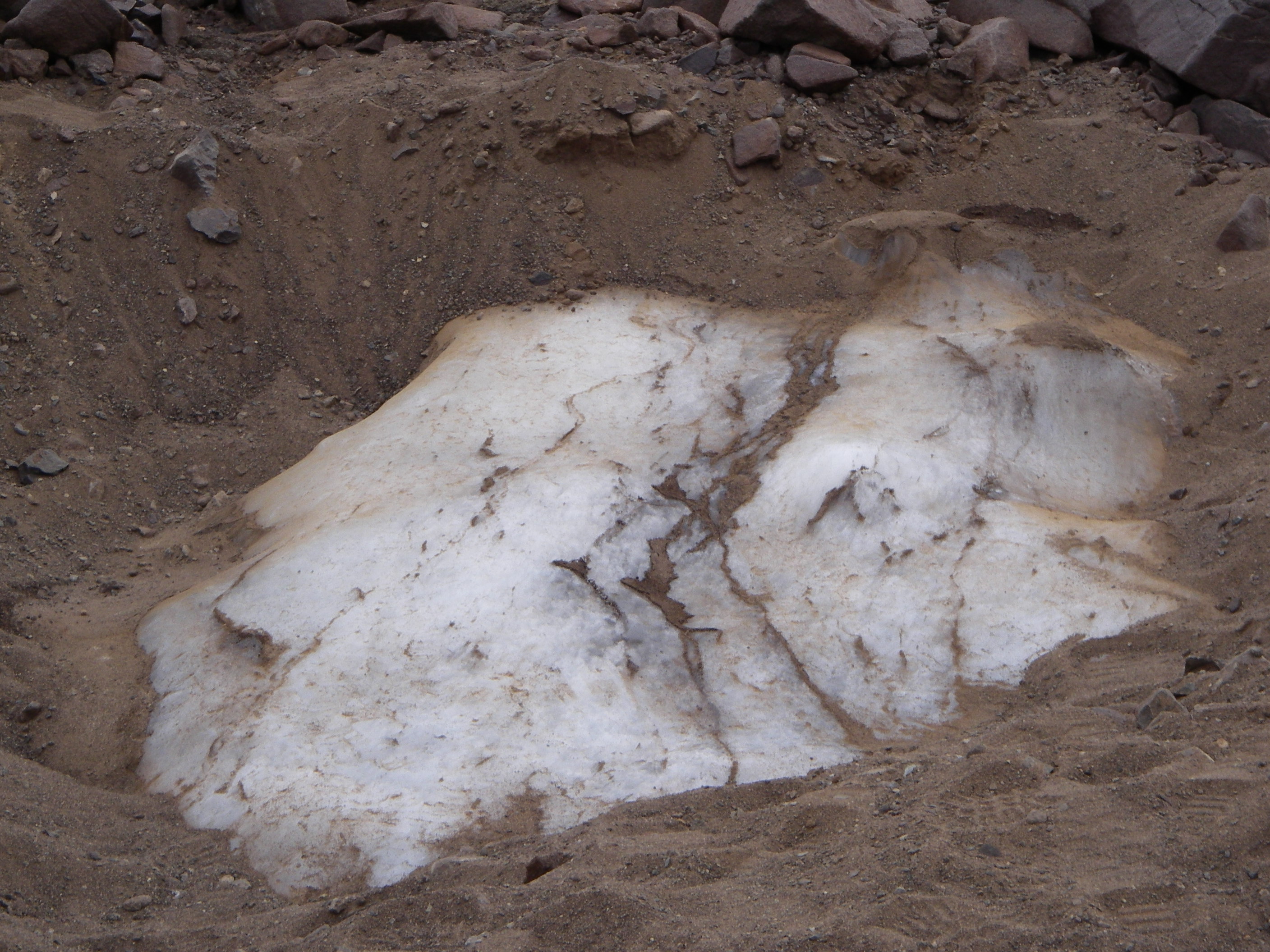These ice cemented sand veins in glacier ice are the vertical extension of polygons on the ground surface. Beacon Valley, Dry Valleys, Antarctica.