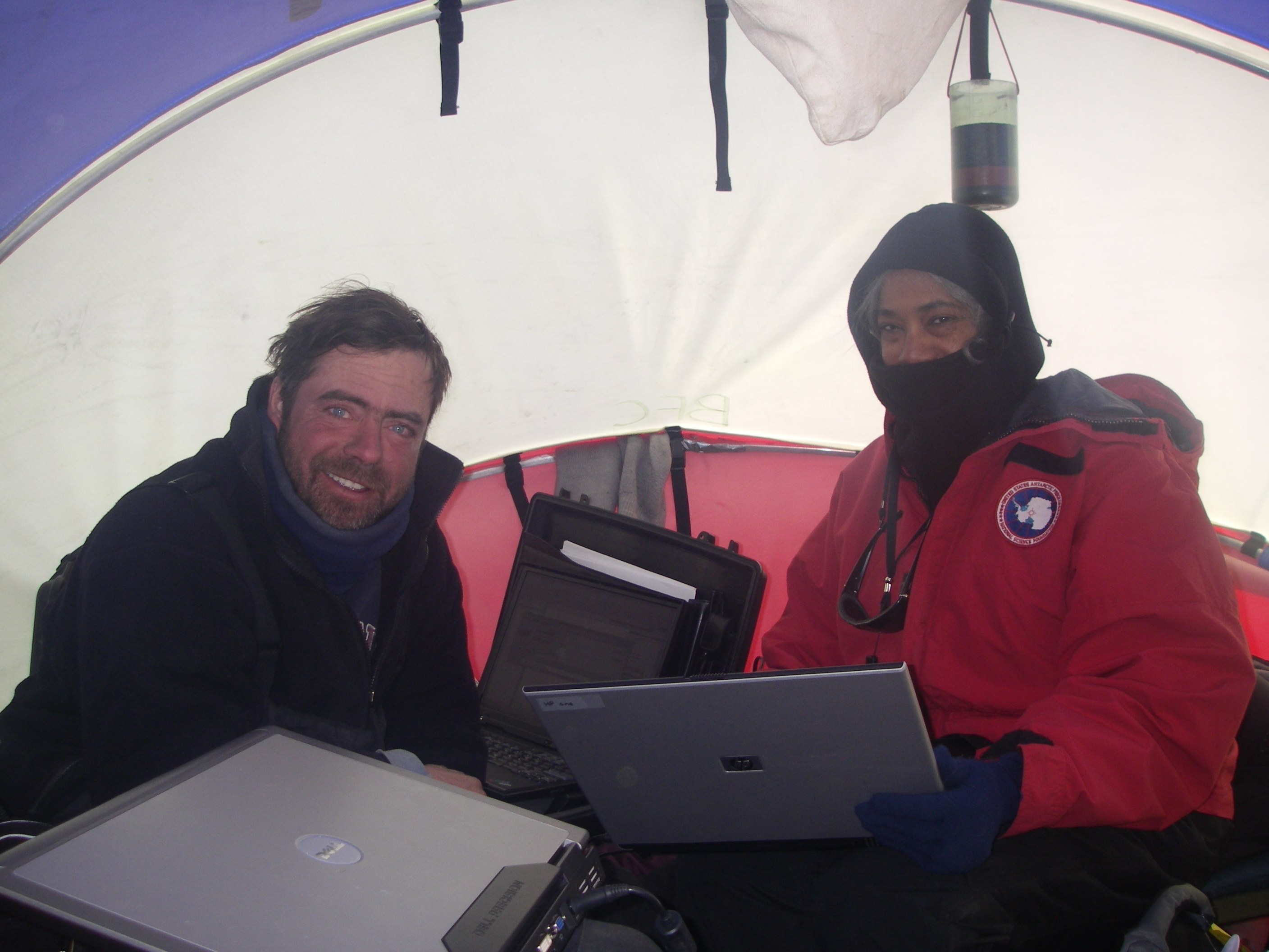 David Marchant and Jackie Hams. Jackie has not adapted to the cold like Dave – she has to wear glove liners and cover her face. Beacon Valley, Dry Valleys, Antarctica.
