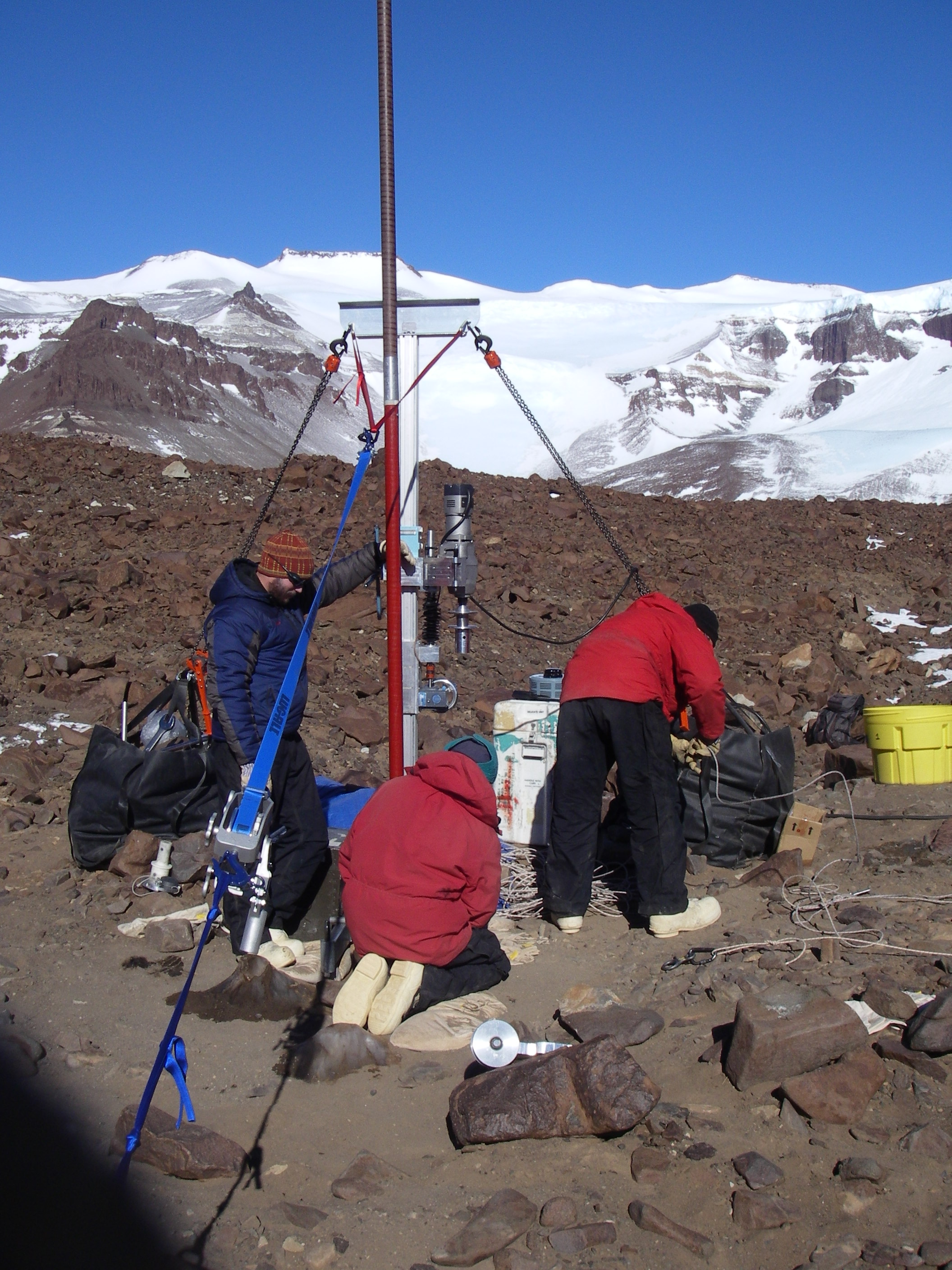 Tanner Kuhl (standing in blue jacket), the driller, contemplates abandoning Site 3. Beacon Valley, Dry Valleys, Antarctica.