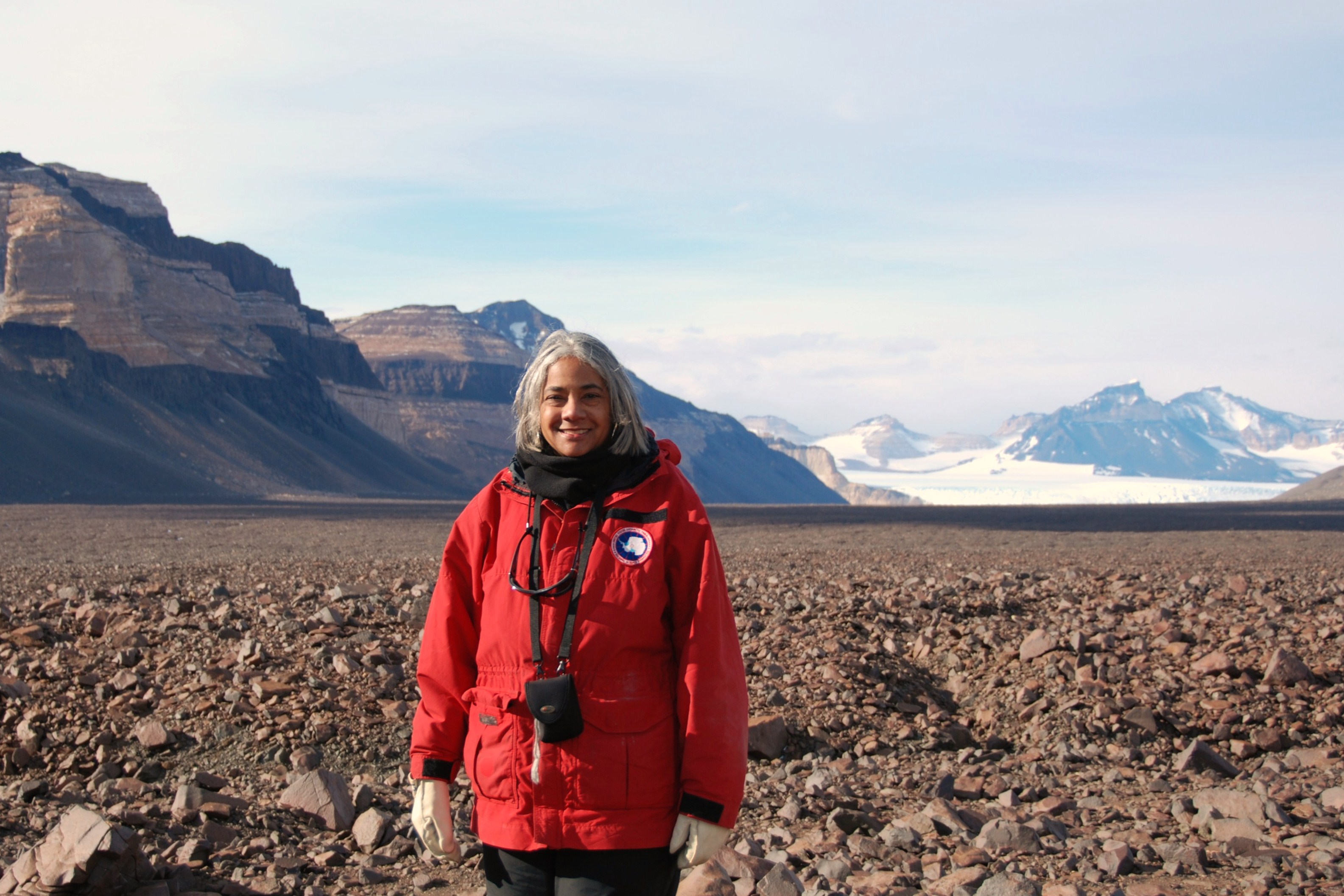 Jackie Hams in Beacon Valley. Taylor Glacier is in the background. Beacon Valley, Dry Valleys, Antarctica.