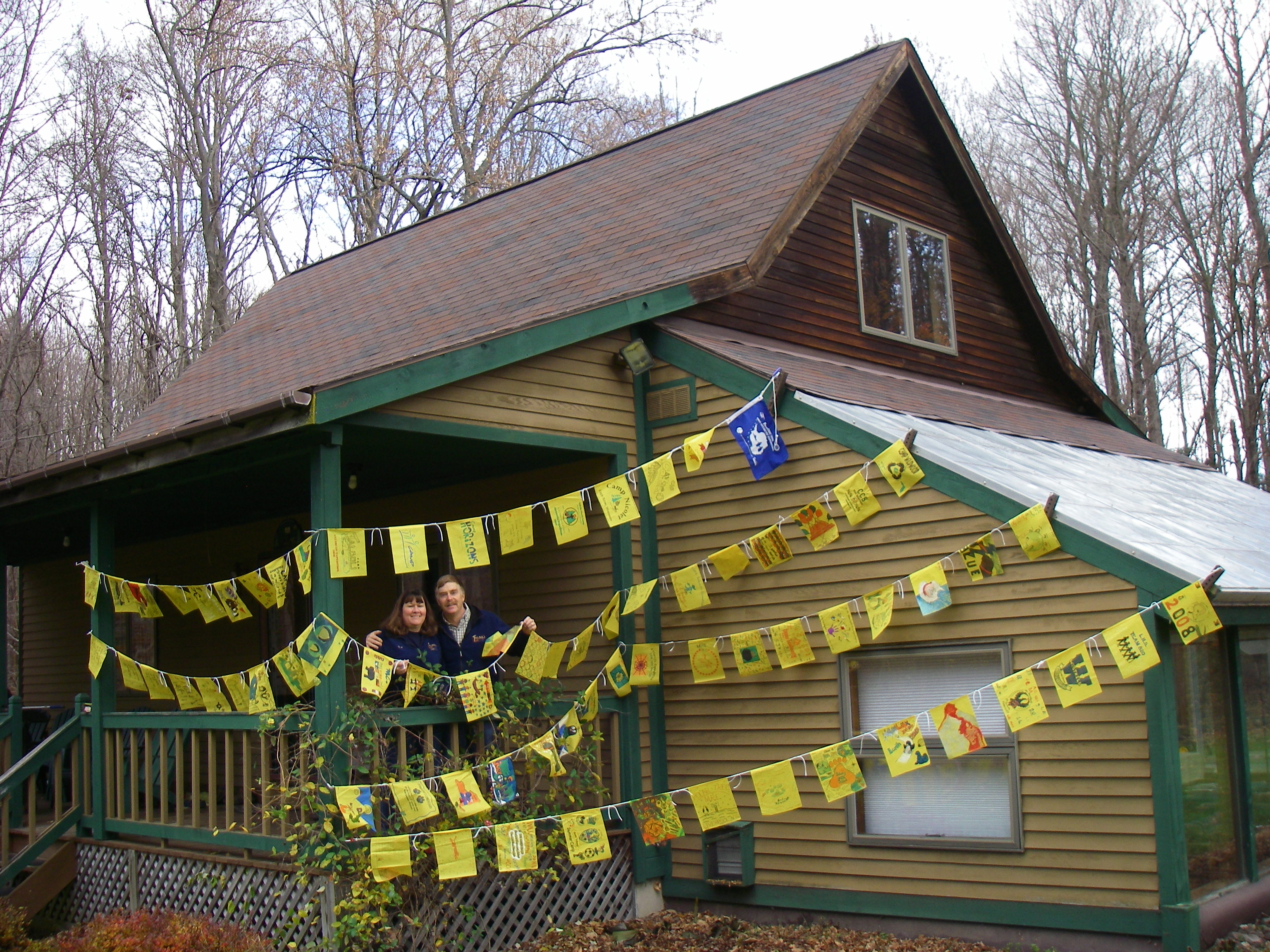 Jan & Jeff Peneston with some of the expedition flags that Jeff will take to Antarctica aboard the Oden. They gave the flags a little "test flight" off the front porch of our house. Camp Talooli, Pennellville, New York.