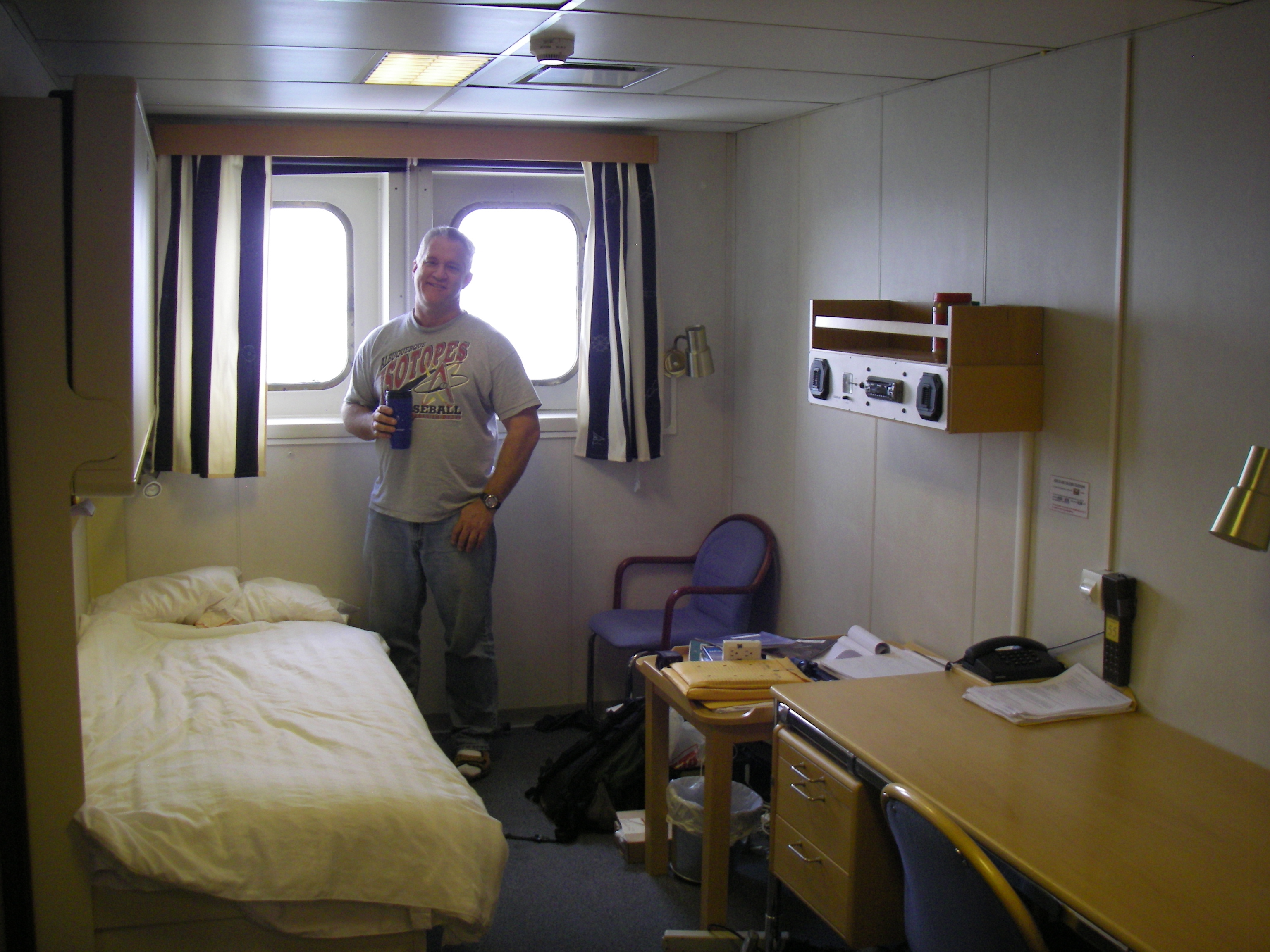 Dr. Ellery Ingall from the Georgia Institute of Technology and Jeff Peneston share a cabin designed to hold four people. There is a wall and a door that separate the cabin into two rooms. This photo shows Ellery on his side with two windows and a desk. Aboard the icebreaker Oden.