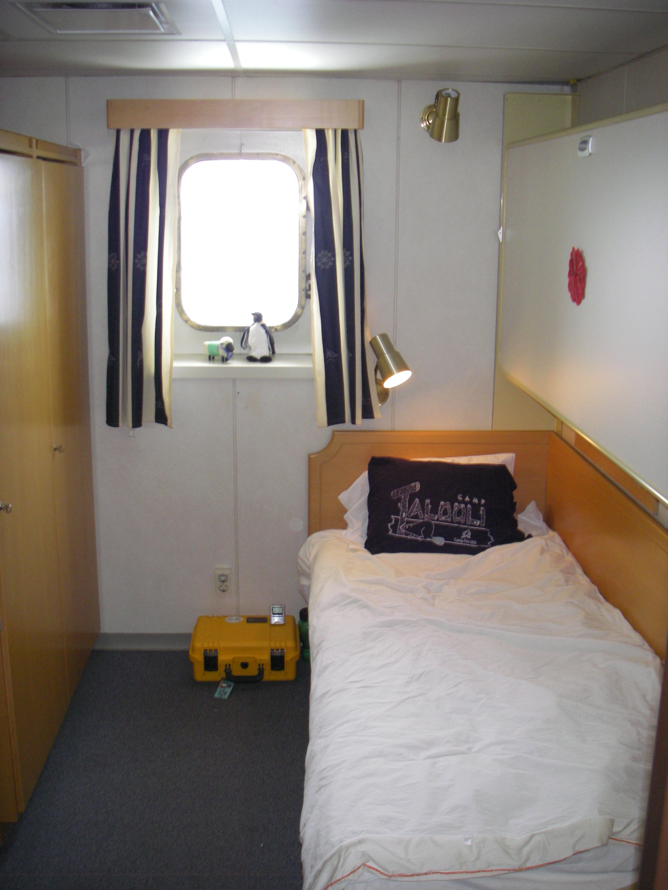 Jeff Peneston's half of the cabin is smaller but it includes four large closets and the cabin’s private bathroom. They are responsible for keeping their cabin clean and can get fresh linens and towels each week. The crew even inspect their rooms for cleanliness! Notice the stuffed animals on the windowsill and the Camp Talooli pillowcase. Aboard the icebreaker Oden.