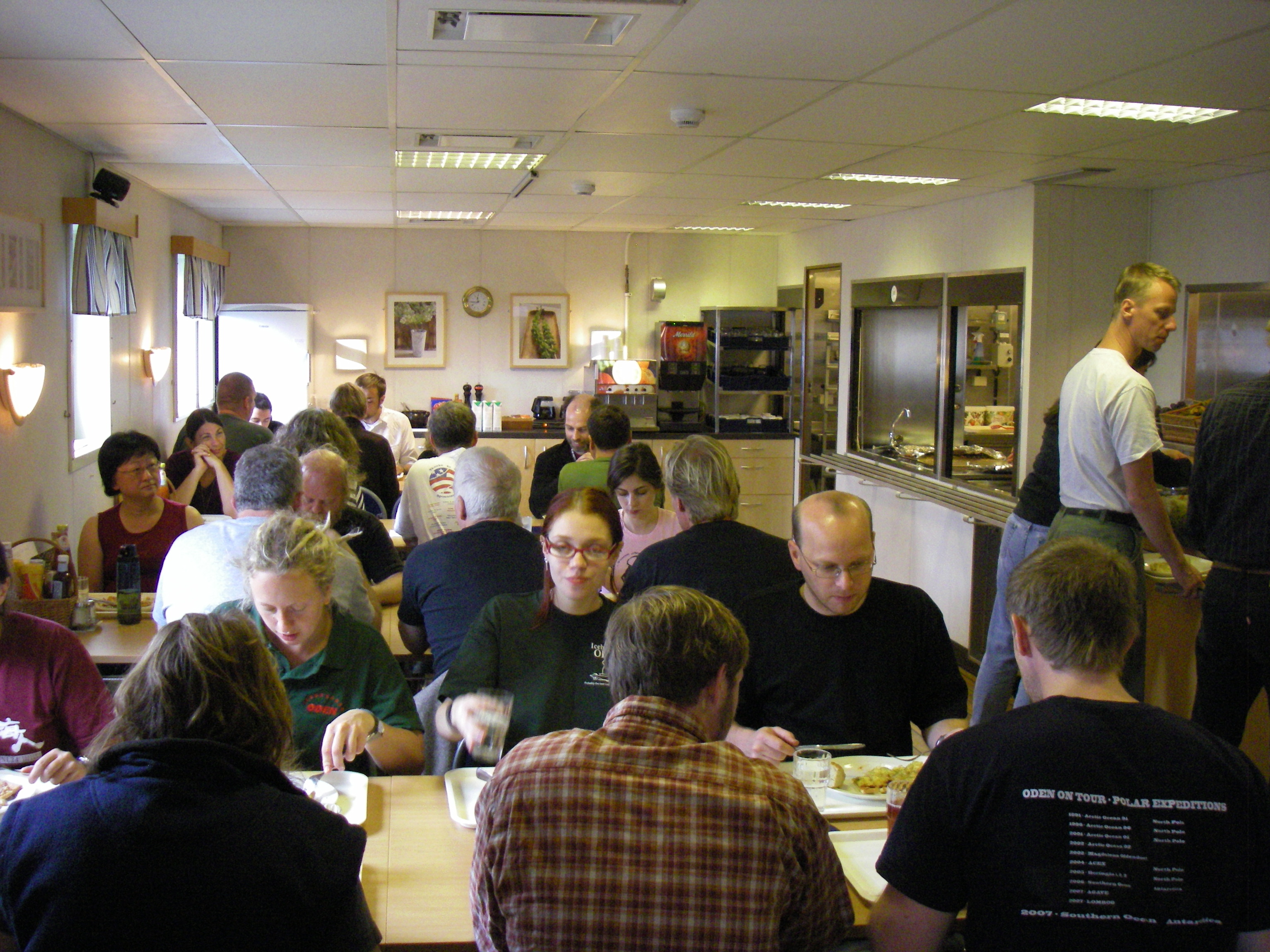 The kitchen staff prepares the tasty meals on the Oden. Breakfast is from 7:30-8:15am, Lunch is from 11:30-12:30 and dinner is from 5:30-6:15pm. There are always snacks and leftovers in the refrigerator. Best of all is a hot cocoa machine that is always ready to please! Aboard the icebreaker Oden.