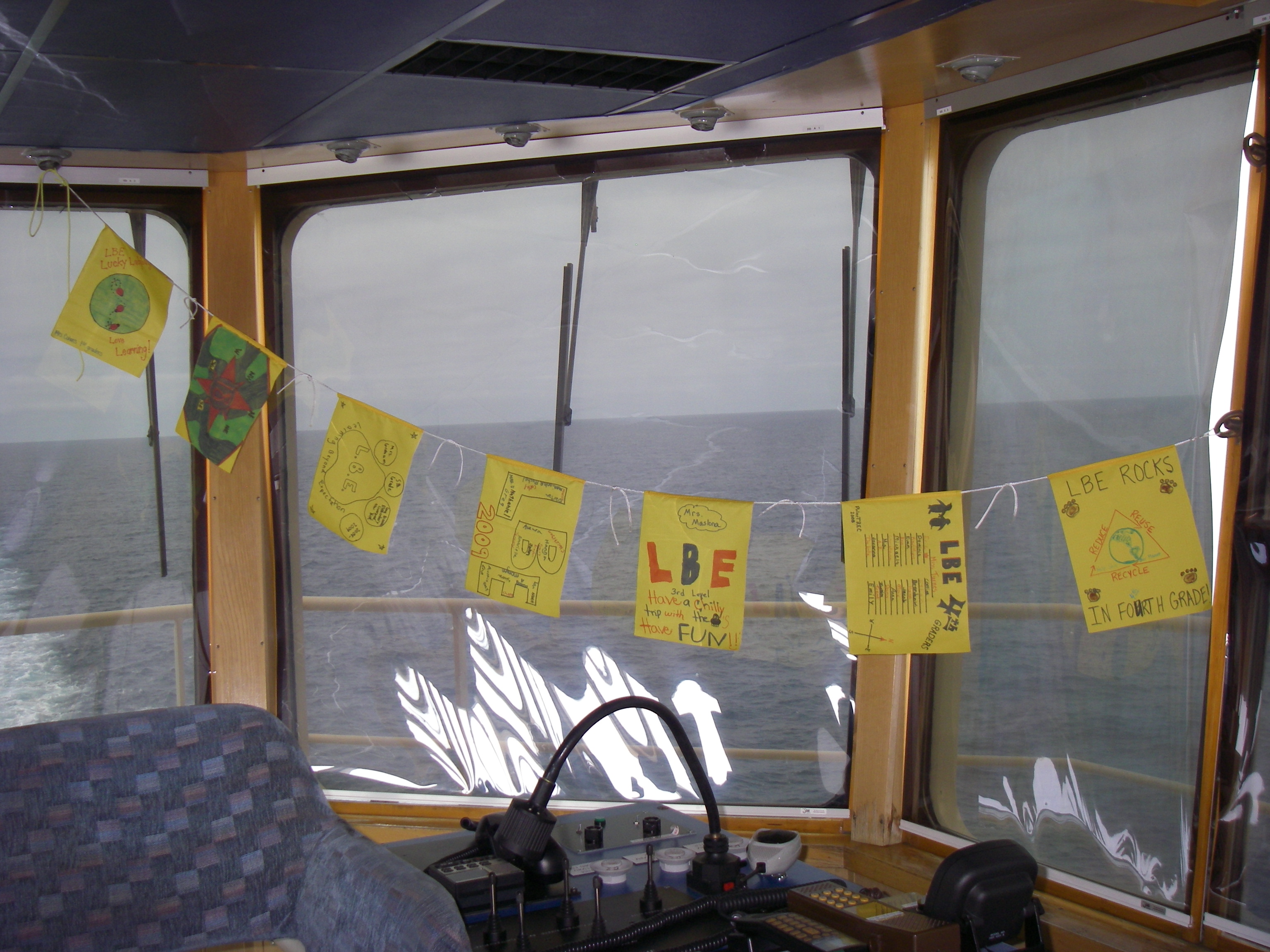 Longbranch Elementary School's seven flags fly on the Oden bridge. Aboard the icebreaker Oden.