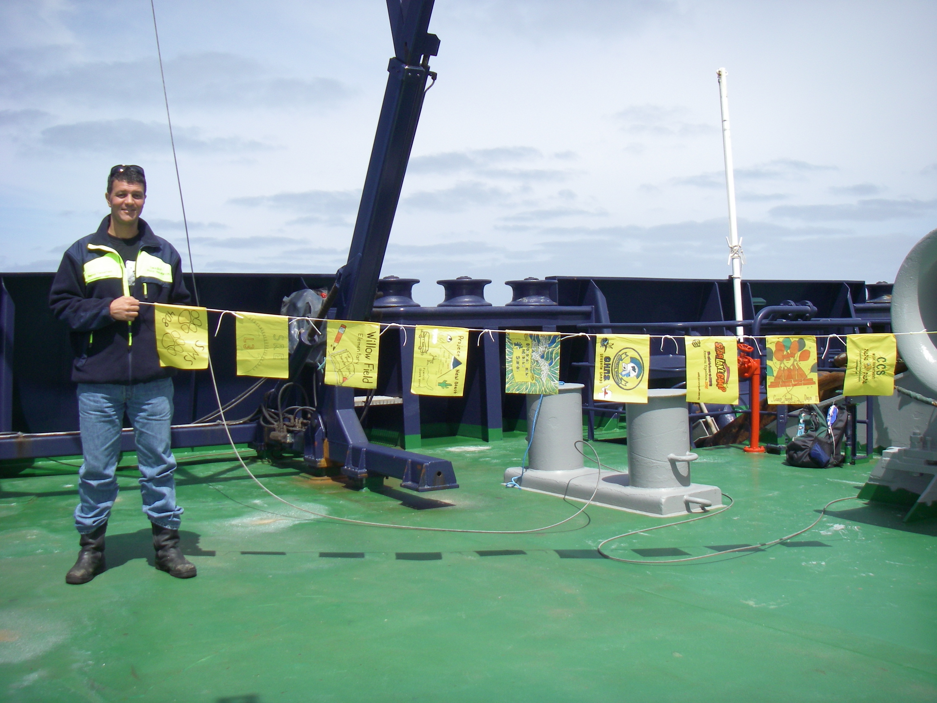 Dr. Magnus Tannerfeldt is the Science Coordinator for the entire expedition. He was very happy to help Jeff Peneston fly these flags on the bow of Oden. They waited for a moment when there was almost no wind so you could clearly see each design. Aboard the icebreaker Oden.