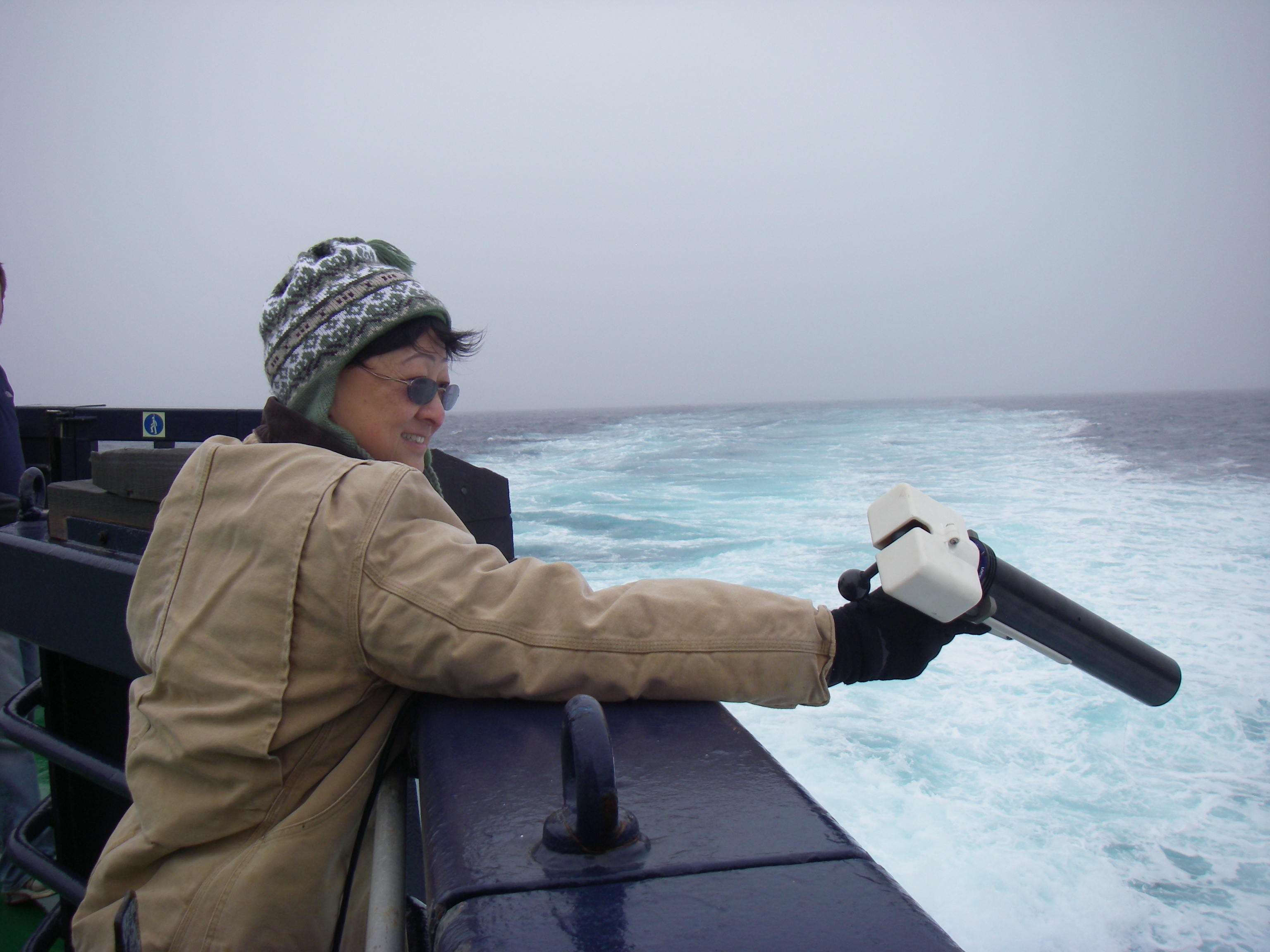 Dr. Xiaojun Yuan fires a XBT temperature and depth probe over the rail of the Oden in the Drake Passage. The expendable sensor measures water temperature and depth as it plunges toward the bottom. A coil of copper wire unrolls behind the sensor and transmits data back to the ship as the probe sinks. Each XBT sensor can only be used once but it is much less expensive than using the large CTD sensor that requires the ship to come to a stop for over an hour as a crew of people use a crane to lower the sensor package over the side and return it to the ship. Aboard the icebreaker Oden.