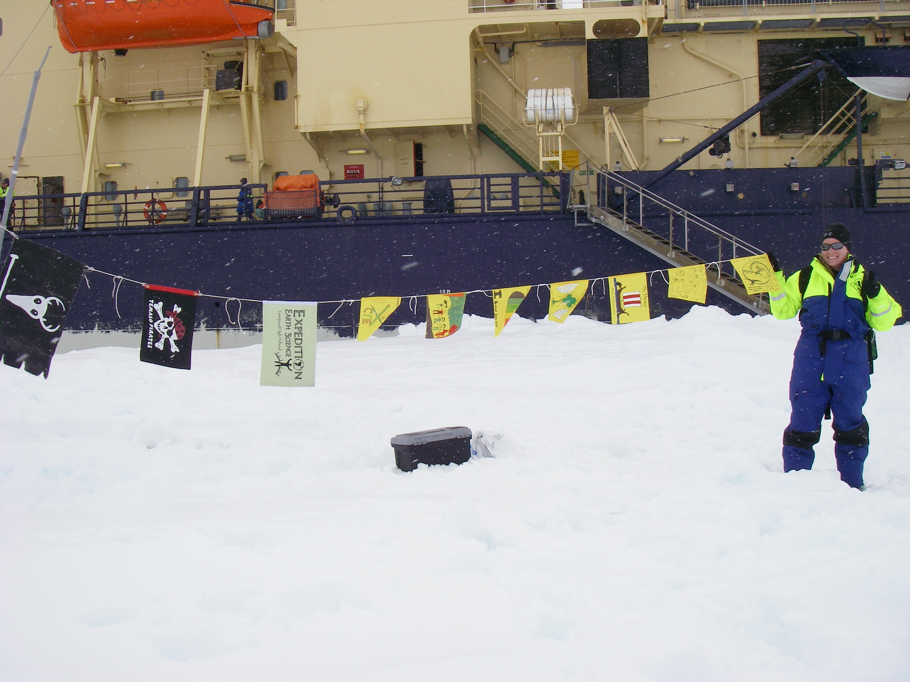 PhD student, Alex Mass helped Jeff Peneston capture the underwater video and then she held up the day’s flags. On the sea ice, near the icebreaker Oden.