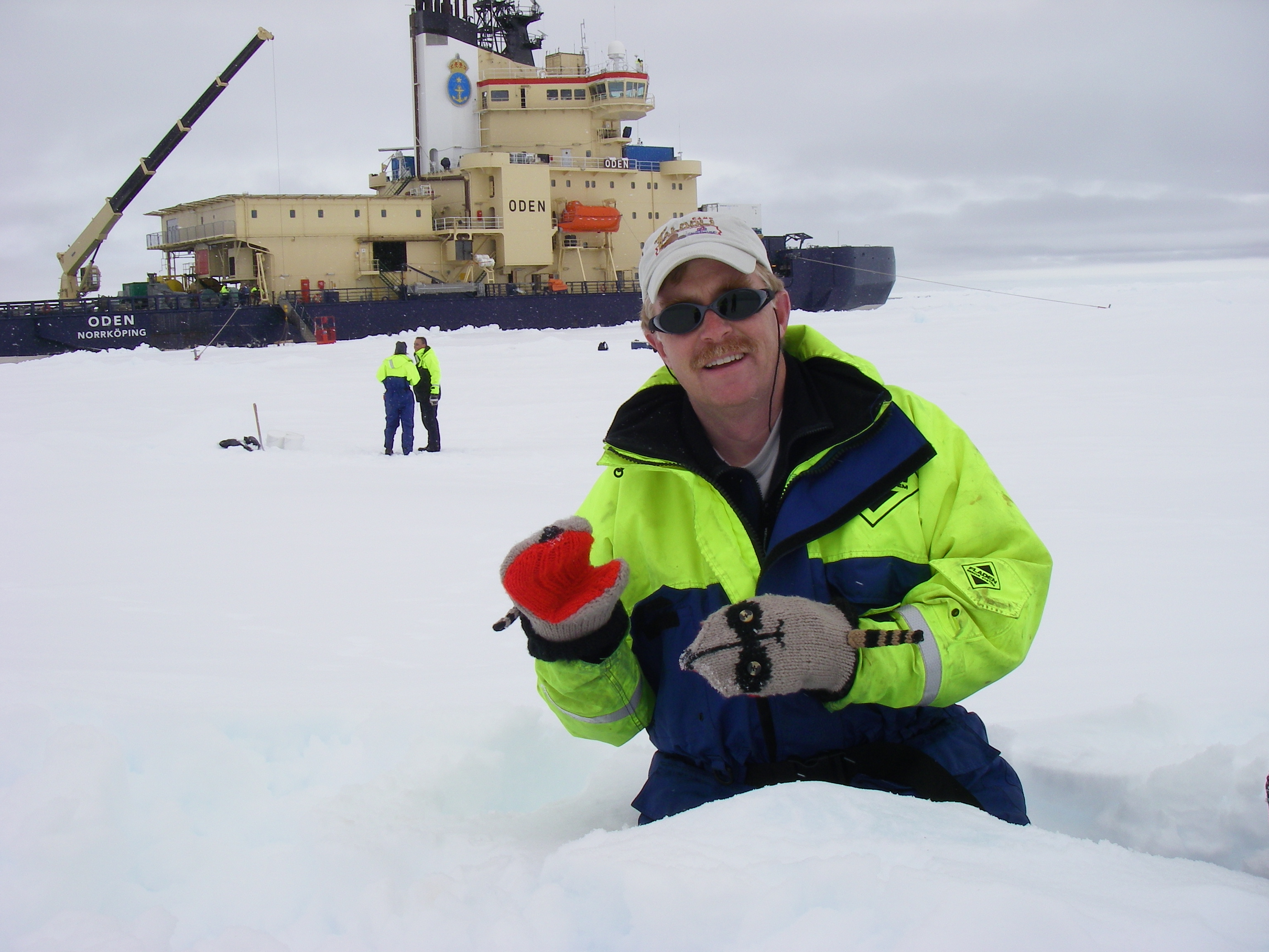 Jeff Peneston says, "this photo is for my mom who knitted her son these cool mittens. Actually, she has knitted raccoon puppet mittens for the kids in the family for many years and a while back I started asking her for an adult pair. Thanks mom!" On the sea ice, near the icebreaker Oden.