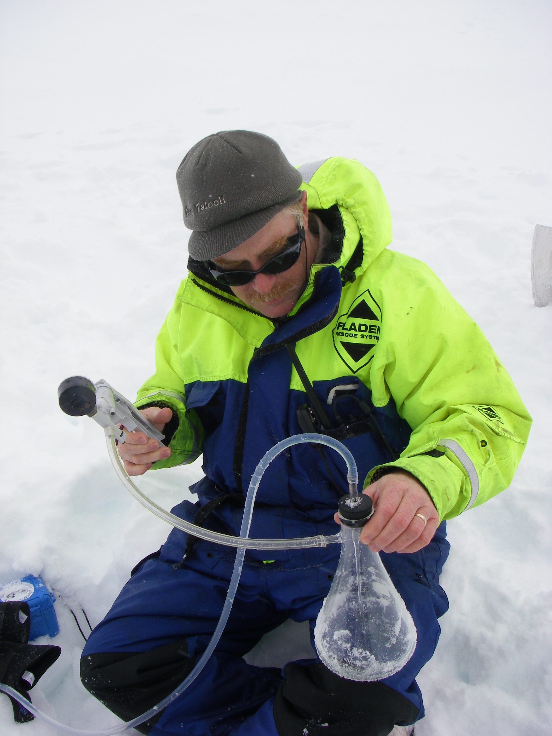 The pump in Jeff's right hand sucks the air out of the flask and this pulls the brine up the tube from a shallow hole drilled into the sea ice. This brine will then be checked for algae, nutrients, and dissolved carbon. On the sea ice, near the icebreaker Oden.