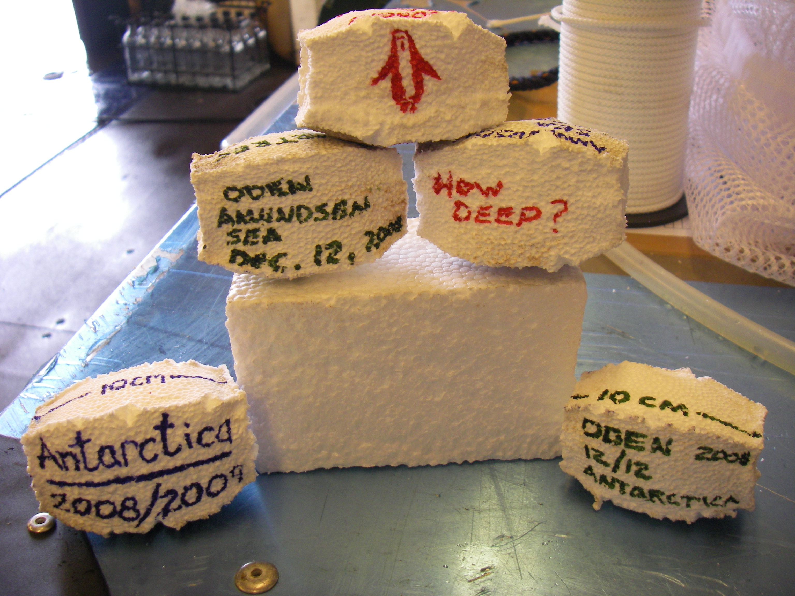 The foam blocks after they have been compressed beneath 3047 meters of seawater. After a two hour trip to the bottom the sea and back, the blocks now average about 2.5cm X 3cm X 5.5cm. Aboard the icebreaker Oden.
