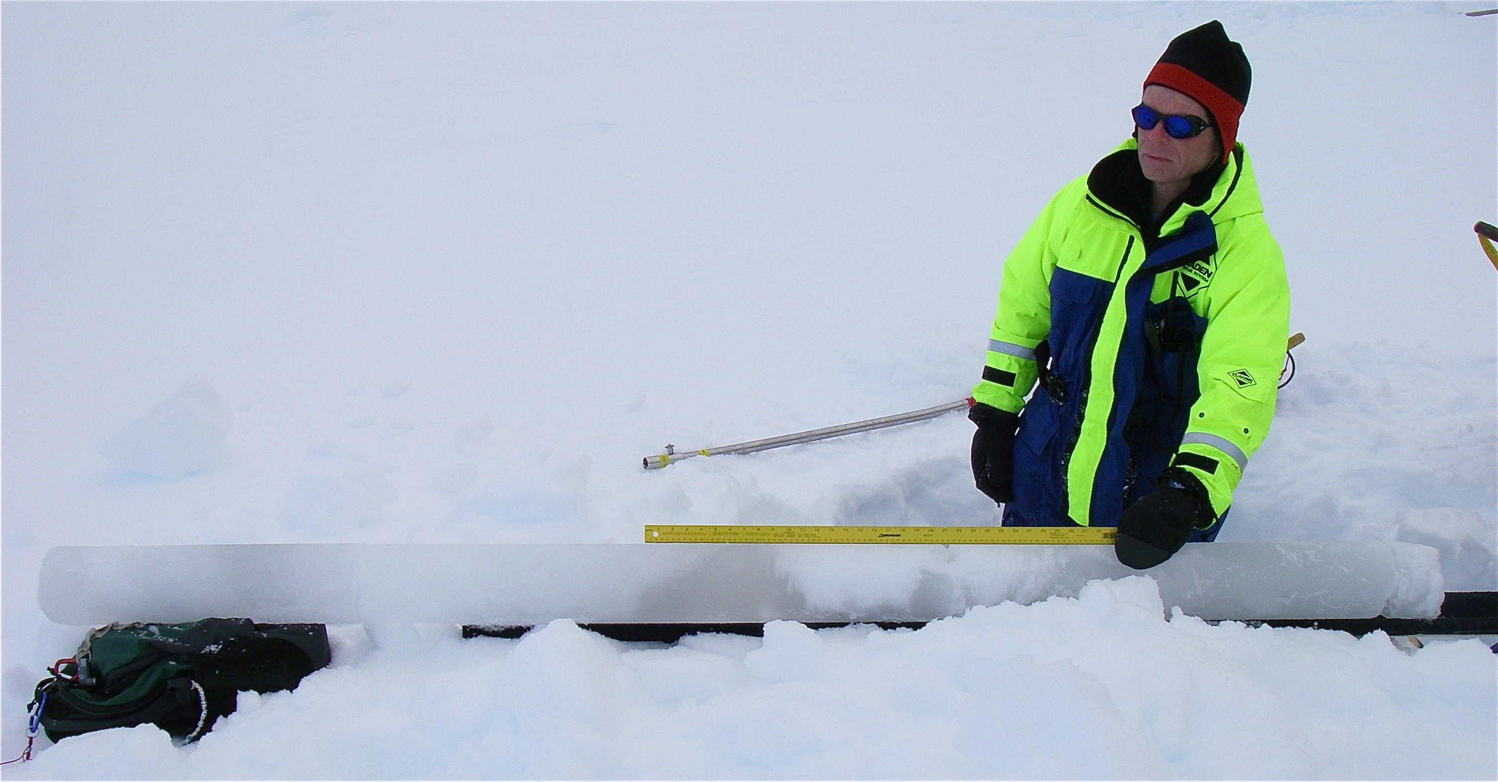 Co-chief scientist, Dr. Walker Smith poses with the largest ice core they had extracted from the sea ice. They had to send the 1 meter hollow core drill down the same hole three times before they reached the bottom of the ice on this floe. When they put the pieces together the core showed that the sea ice was over eight feet thick. There was also over two feet of snow on top of this ice floe. On the sea ice, near the icebreaker Oden.