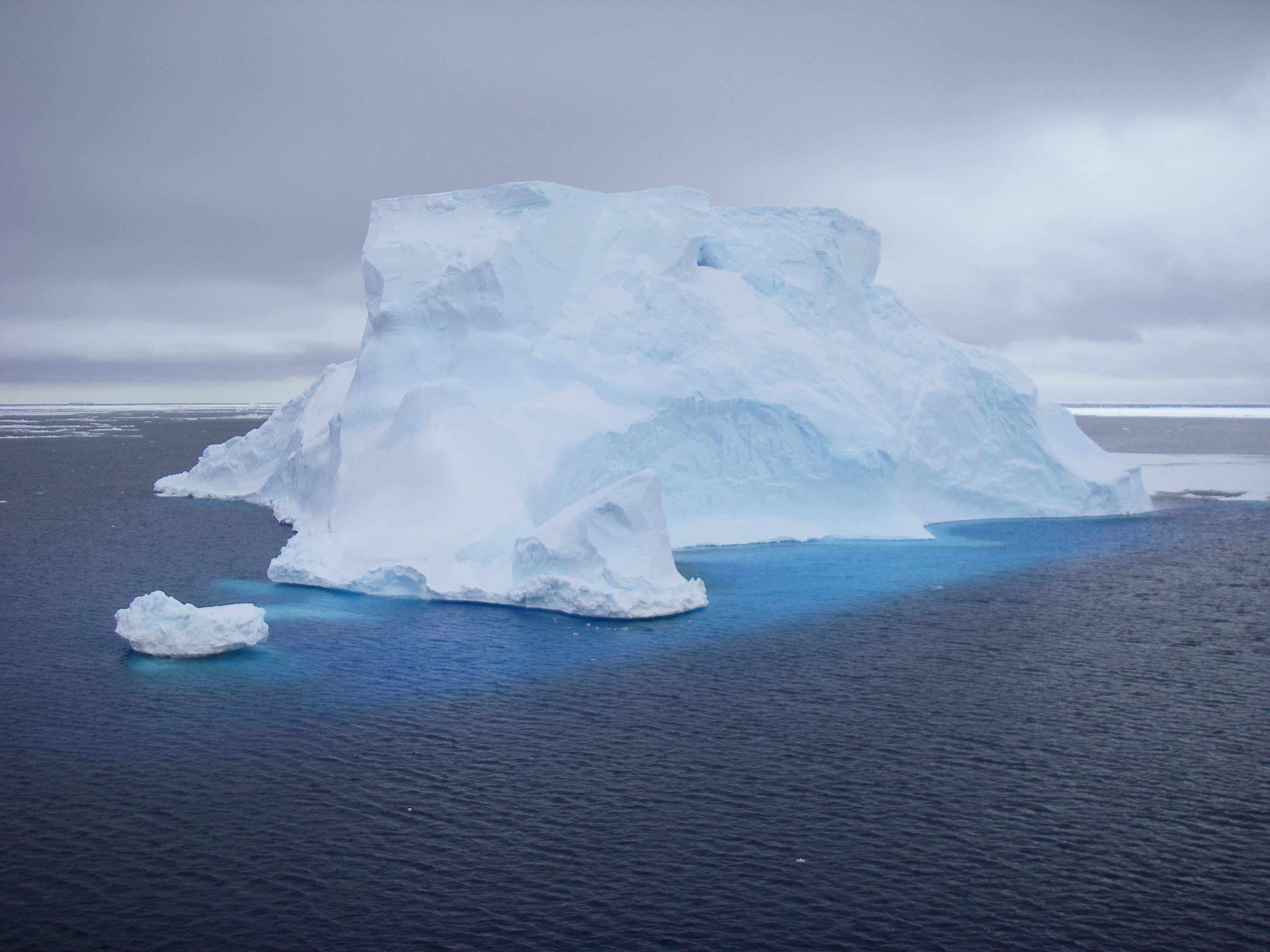 We all know that most of an ice cube floats below the surface. One rule of thumb says to multiply the amount of iceberg you see by seven times to estimate the true size of the iceberg. In this photo notice the light blue water that reaches out from the main iceberg and includes the area around the little iceberg in the foreground. That blue water shows part of the ice that is below the water line. The little iceberg is actually part of the bigger iceberg. Aboard the icebreaker Oden.