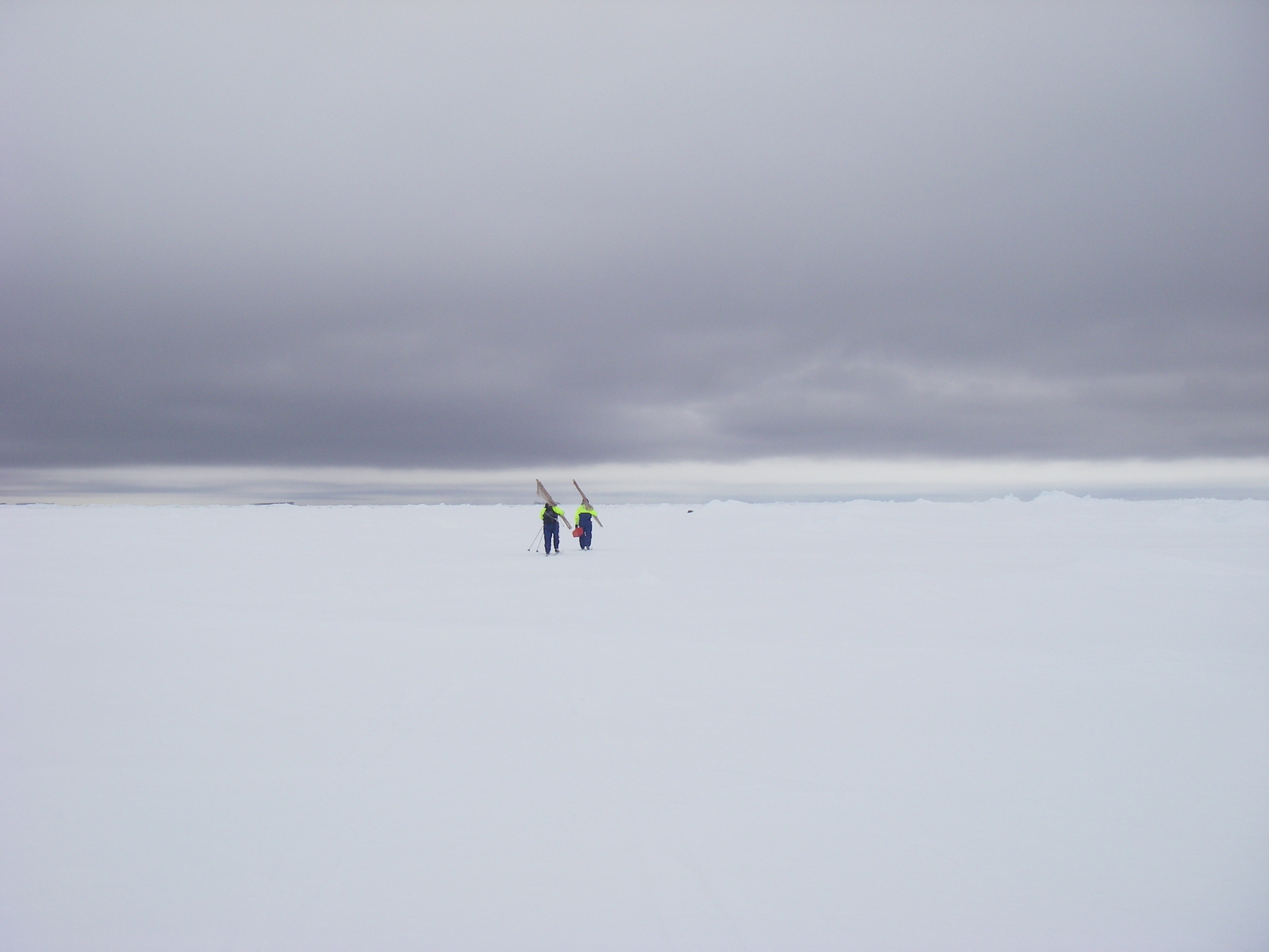 Jonas Tielmann and Tero Härkönen each carried a net attached to long, wooden poles as they skied toward the resting crabeater seal in the middle of this ice floe. On the sea ice, near the icebreaker Oden.