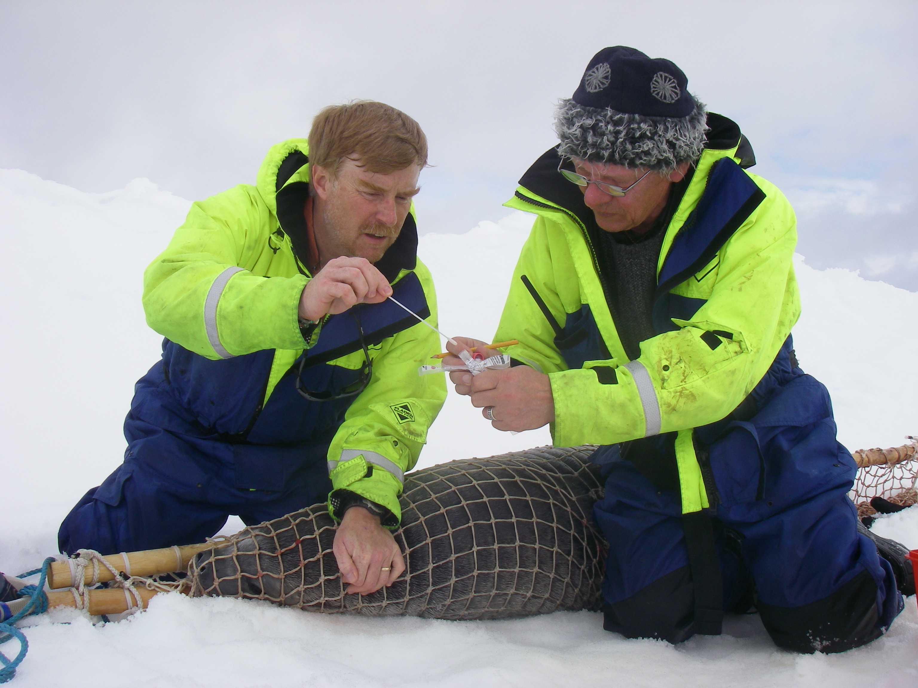The nasal swab is quickly sealed into a sterile tube with a preservative. Once the team gets back to Sweden, the bacteria and viruses can be identified. Jeff's first concern was to try to comfort the unhappy young seal in the net. Within minutes the procedures were complete and the seal was released. On the sea ice, near the icebreaker Oden.