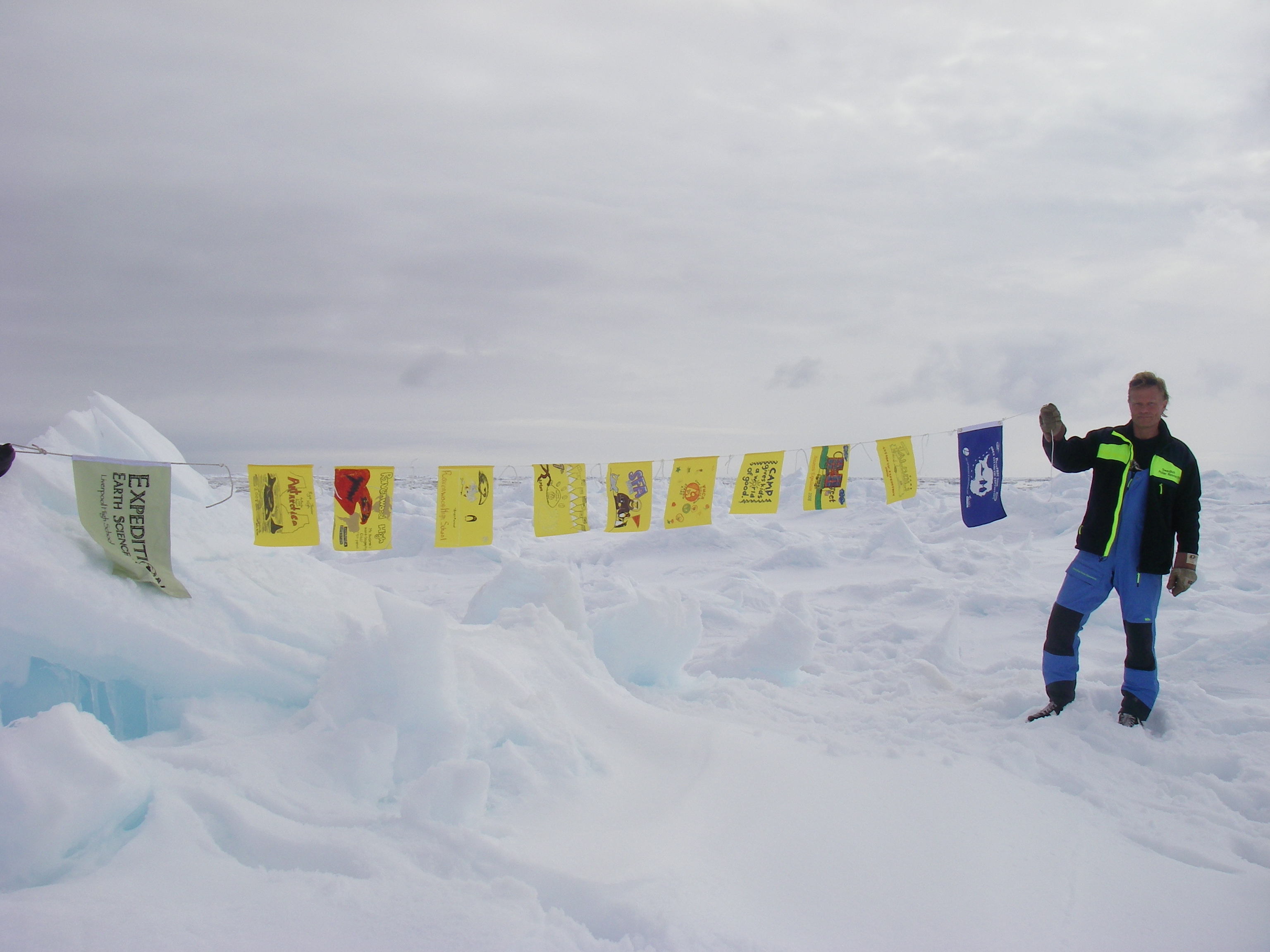 Expedition flags flew over the seal research team as they worked with a huge female crabeater seal on the sea ice a mile away from the Oden. The flags were held by Bengt Liljebladh and were created by the following schools and camps: Ms. Ellwood's 8th Grade, Rye Junior High, NH, Cedar Street School, Syracuse, NY, YMCA Camp Indian Springs, FL, Mr. Huebner, Ravenwood High School, Brentwood, TN, The American Camp Association, National Office, IN, Mrs. Doering, St. Francis of Assisi School, St. Louis, MO, Camp Talooli, Camp Fire USA, Pennellville, NY, and The Expedition Earth Science Program, Liverpool High School 9th Gr Annex. On the sea ice, near the icebreaker Oden.