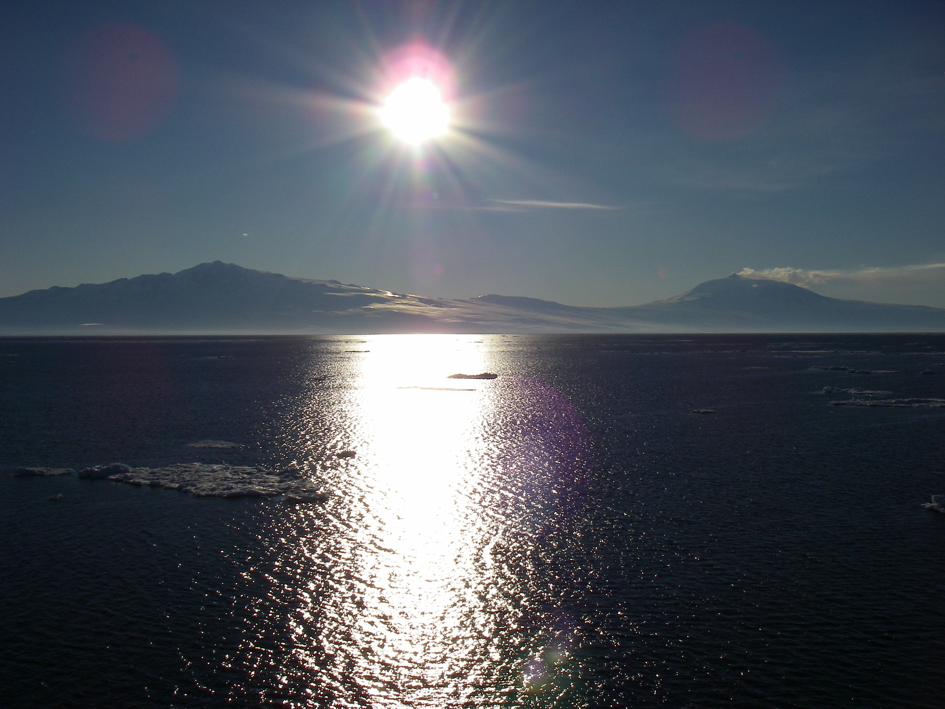 The first view of Ross Island was spectacular. Mt. Terror is a dormant volcano on the left that is 3262 meters tall and Mt. Erebus, on the right, is the most southern active volcano in the world with steam rising from its 3794 meter summit. This photo was taken at the western edge of the Ross Sea Polynya (a polynya an area of open water surrounded by sea ice), and shows the last open water we will see as we enter the sea ice of McMurdo Sound. Aboard the icebreaker Oden.