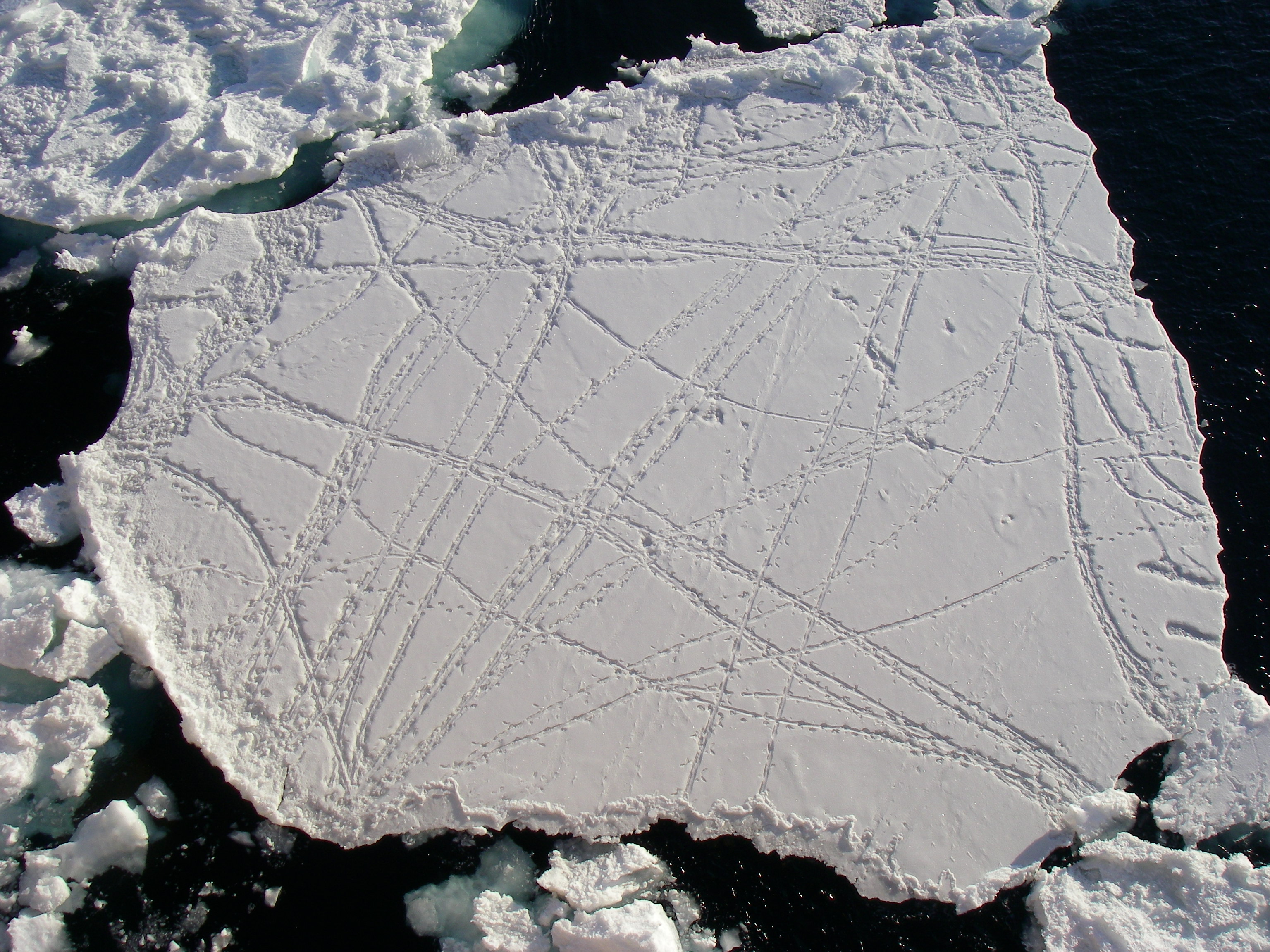 As Jeff Peneston looked down 100 feet from the bridge catwalk, he was amazed at the density of Adelie penguin tracks. Aboard the icebreaker Oden.