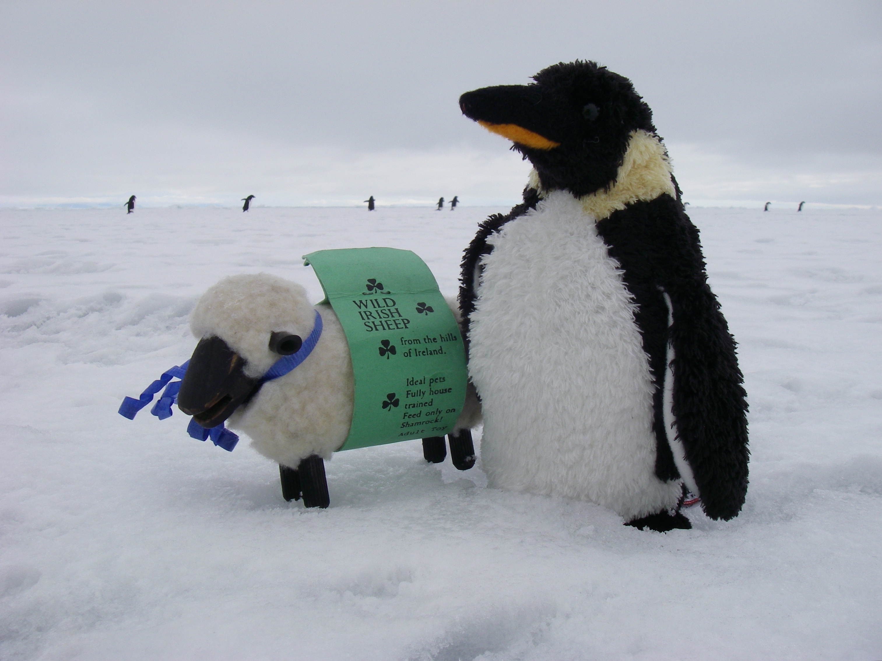 Shamus the Wild Irish Sheep, and Oden the Emperor Penguin have been Jeff Peneston's companions on this expedition. A group of local Adélie penguins came by for a quick inspection of these two very quiet newcomers, but then headed off on penguin business again. On the sea ice of McMurdo Sound, Antarctica.