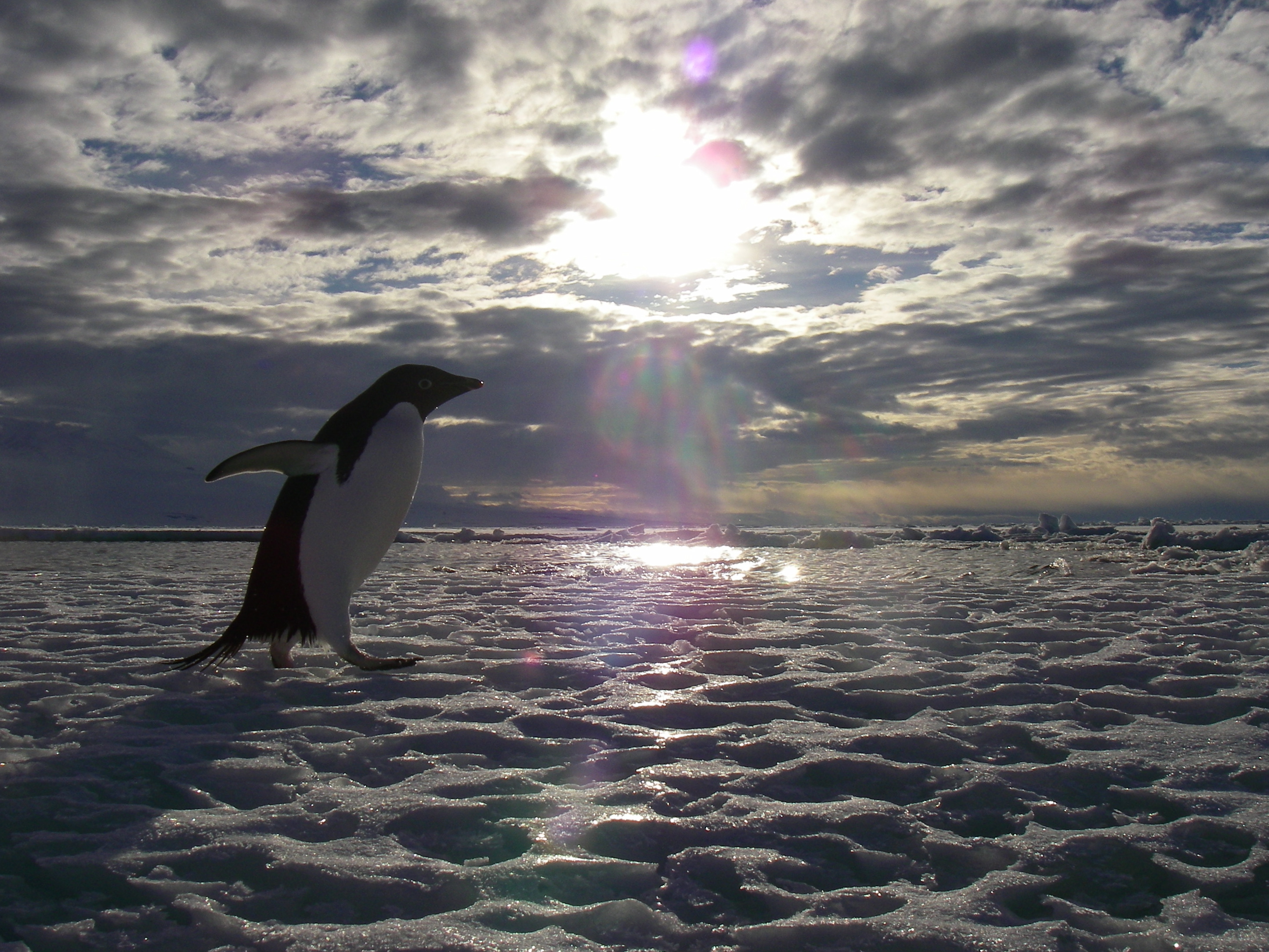 This Adélie penguin walked by Jeff Peneston while the seal research team were on their last all night trek. The sun was just about straight South of the team, and at its lowest angle in the sky. On the sea ice of McMurdo Sound, Antarctica.